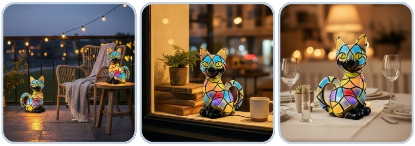 A: This cat lamp provides decorative ambient lighting rather than primary illumination. It creates a warm cosy atmosphere for evening relaxation, nighttime navigation, and gentle sleep lighting whilst serving as an artistic ornament.