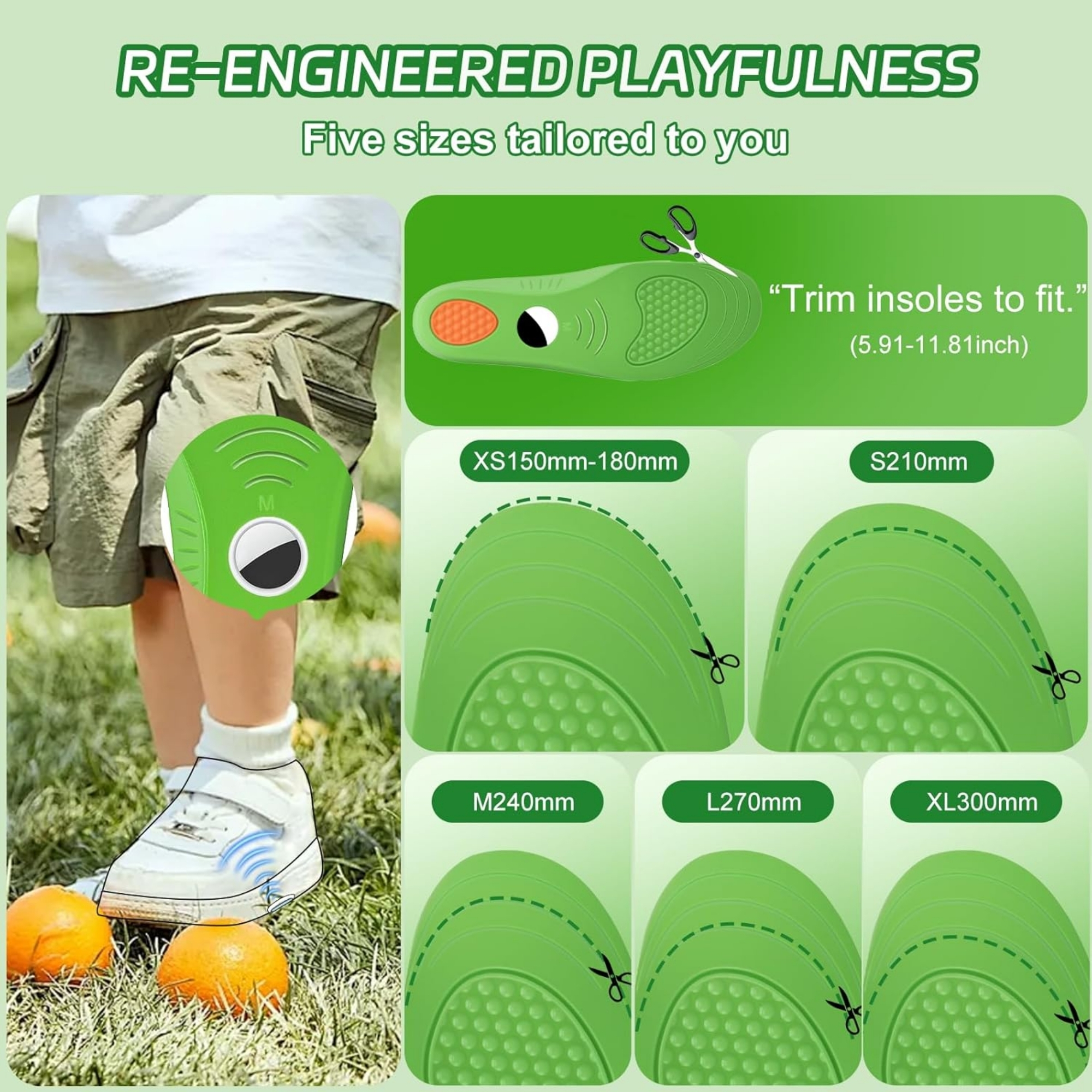 The insole is easily trimmable to fit multiple shoe sizes. We recommend ordering based on the largest shoe size needed, then trimming to fit smaller sizes. Sizes range from children’s to adult XL.
