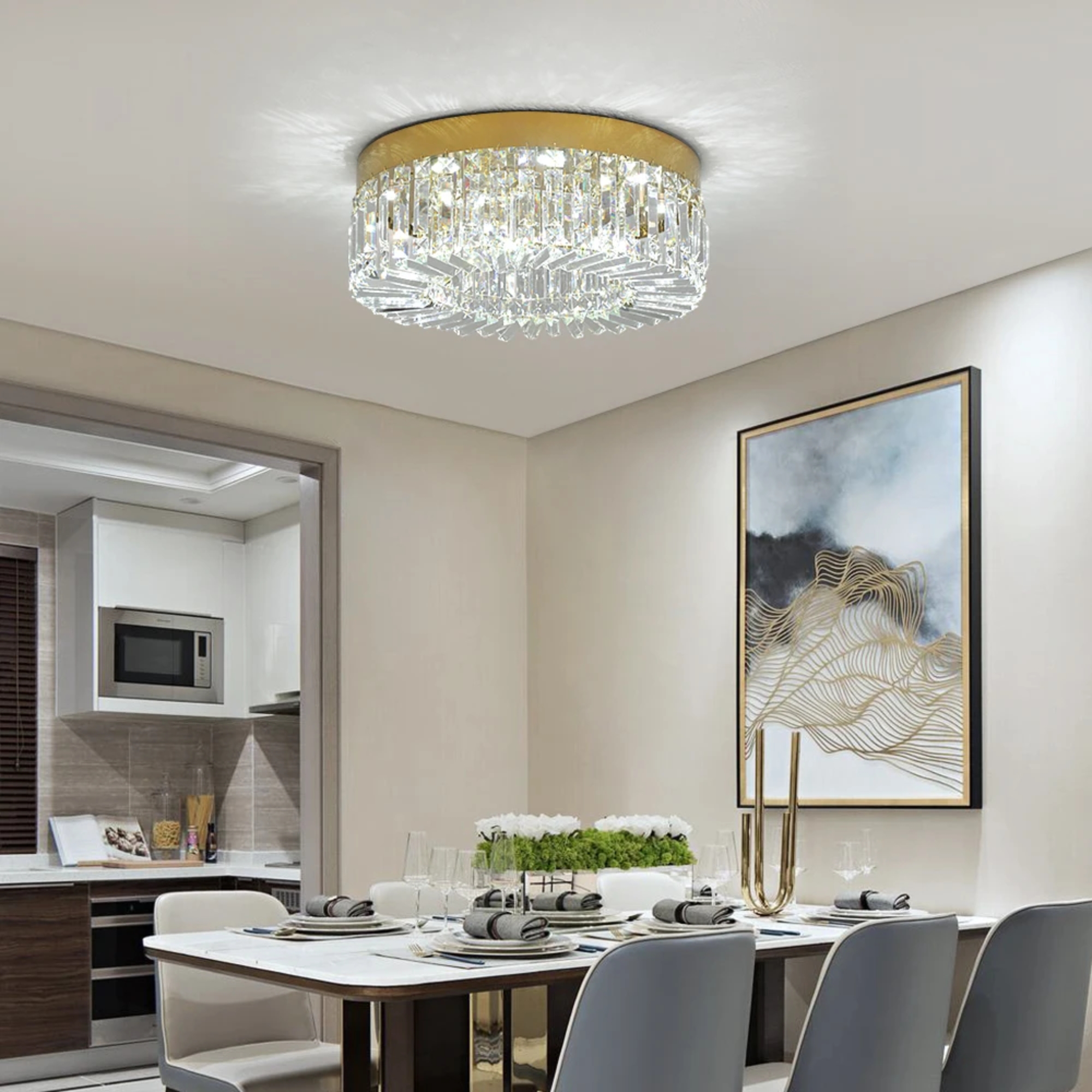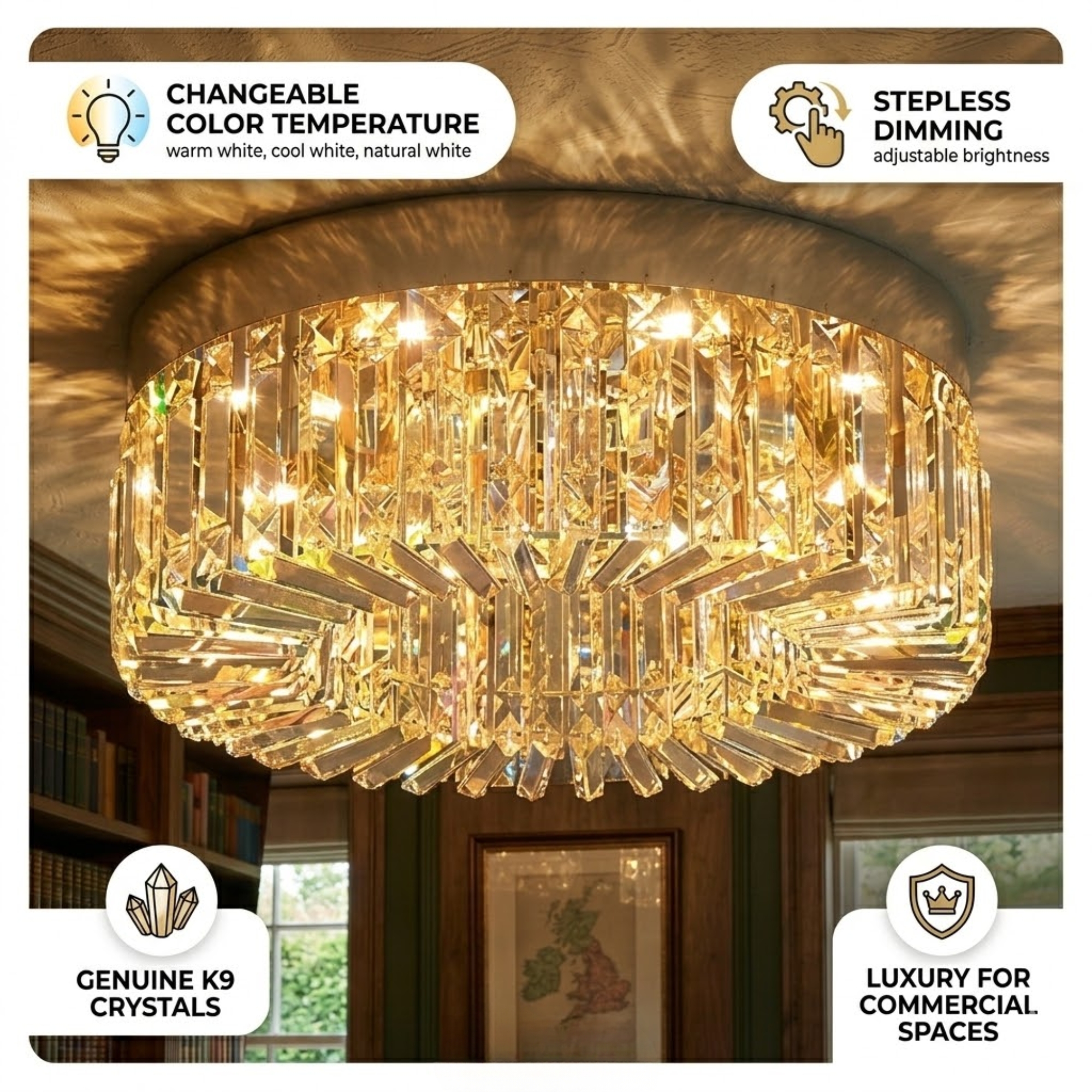 Experience ultimate versatility with the Changeable LED light settings, allowing you to switch between warm and cool tones. The durable gold frame ensures long-lasting brilliance, while the flush mount installation is ideal for various ceiling heights. Ensure your home shines with Picadex quality, combining energy efficiency with a truly opulent visual impact.
