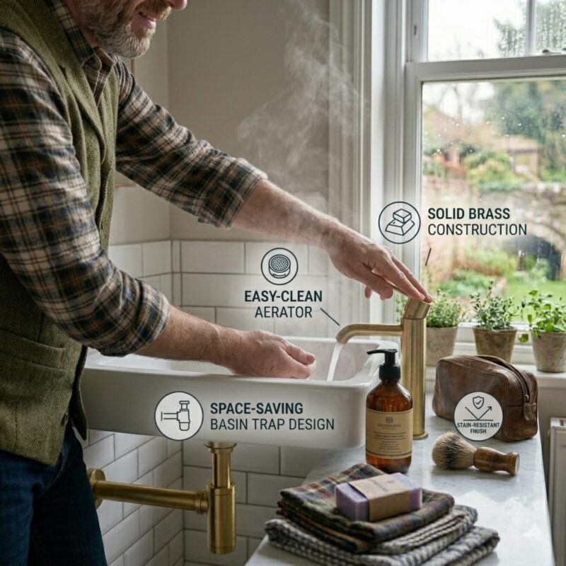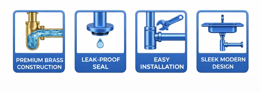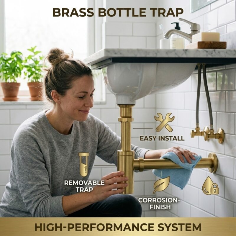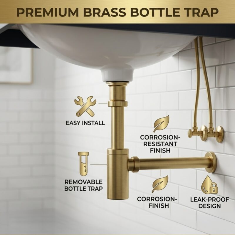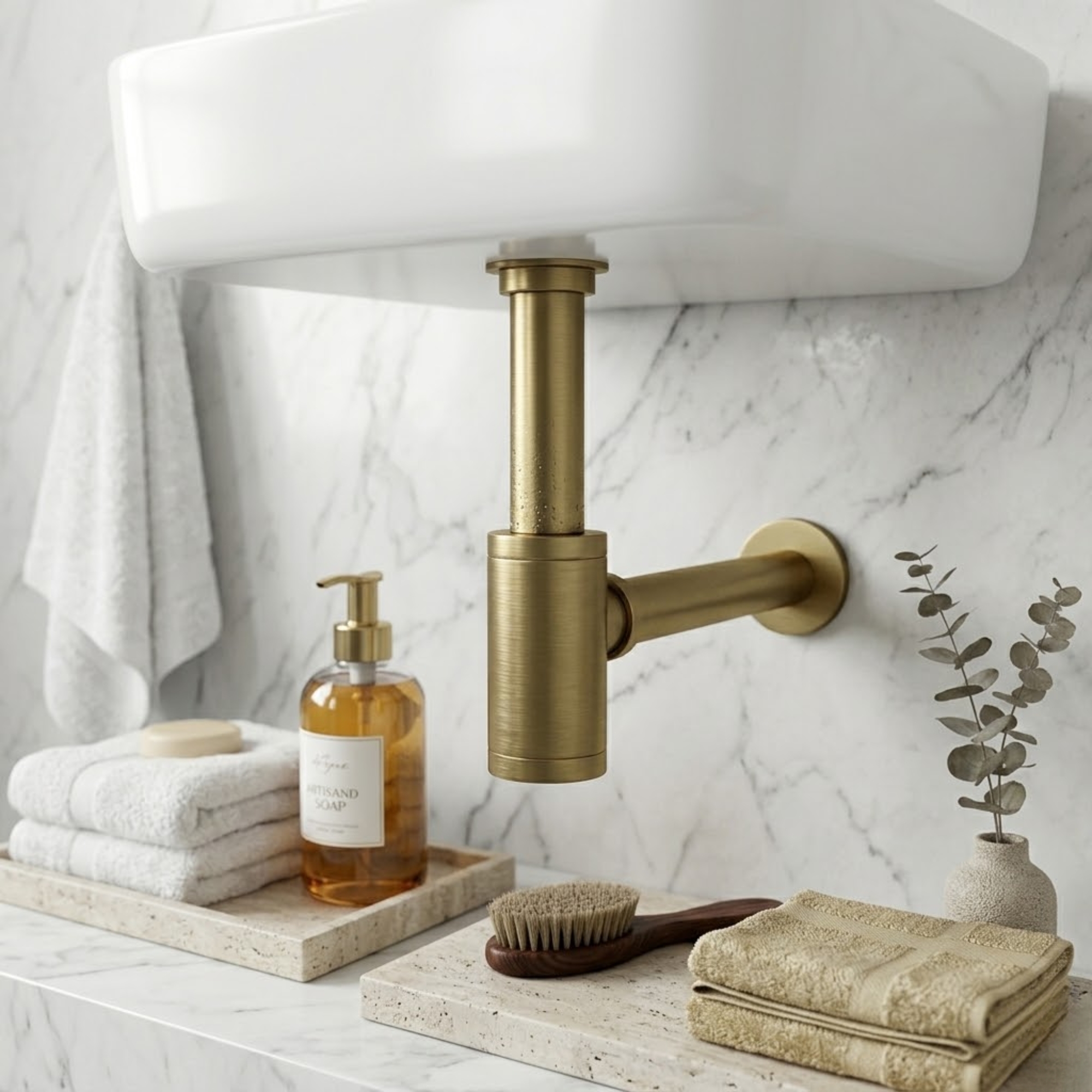 Upgrade your bathroom aesthetics with the Aurev Designer Bottle Trap. Expertly crafted from premium solid brass, this modern fixture replaces unsightly plastic pipes with a sleek, minimalist silhouette. Available in luxury finishes like Brushed Gold and Matte Black, it ensures your basin looks as stunning underneath as it does on top.