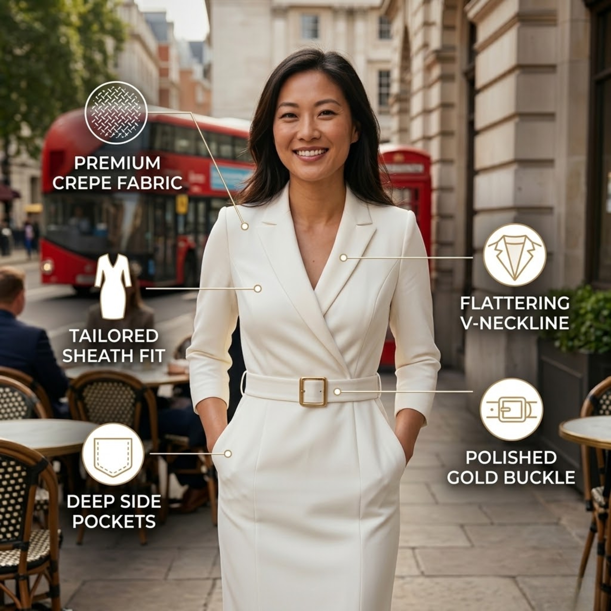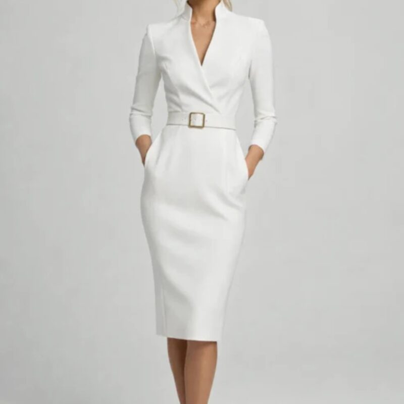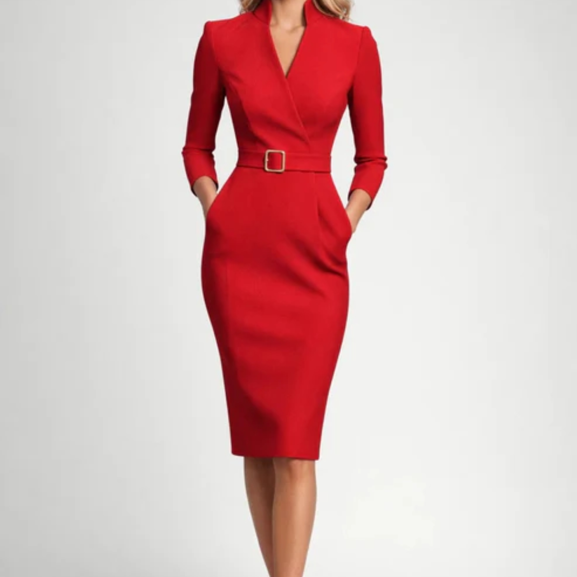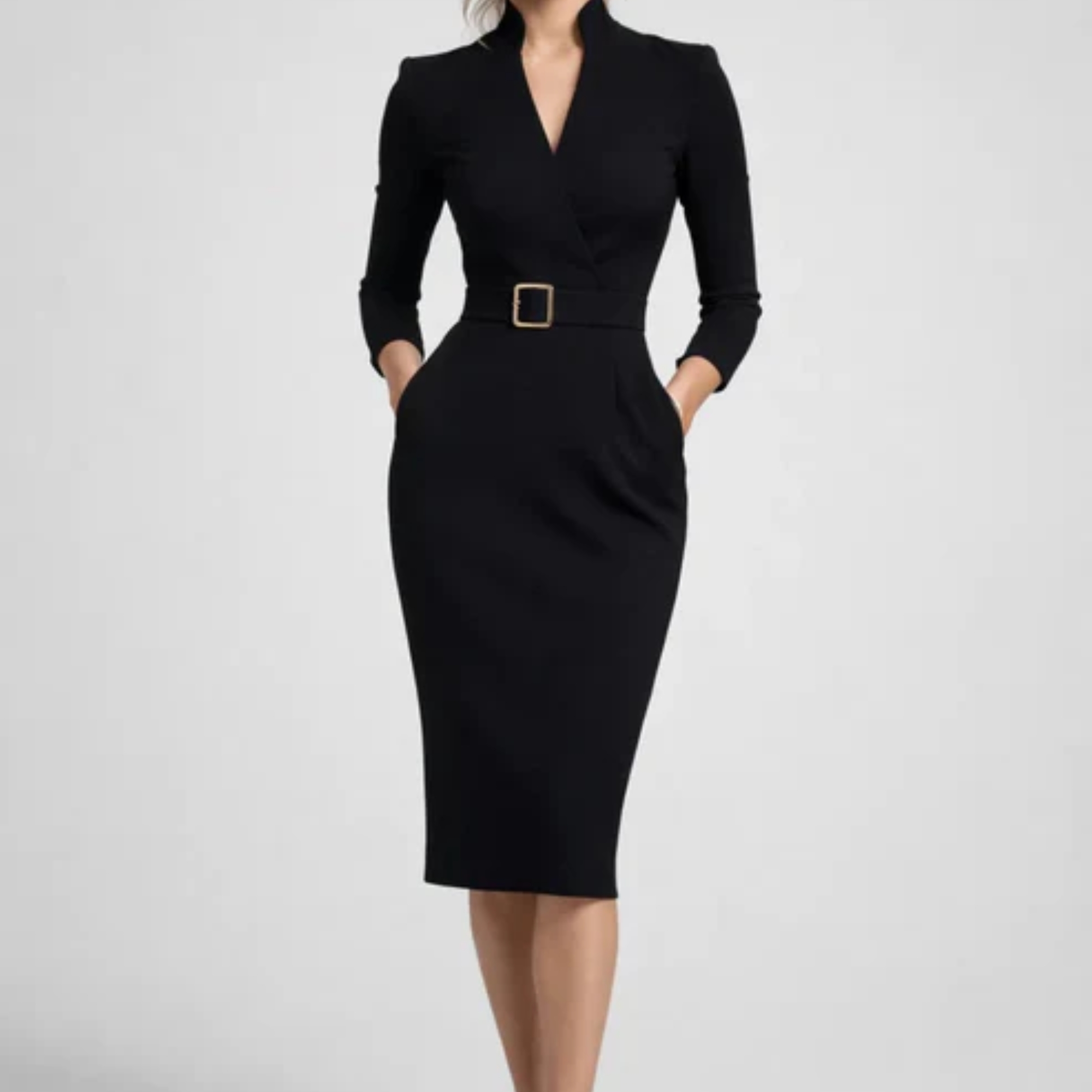 Featuring elegant long sleeves and an integrated gold-buckle belt, this dress masterfully cinches the waist for a flattering, feminine shape. The high-end temperament design ensures a luxurious aesthetic that never goes out of style. Whether attending a corporate event or a formal dinner, the Aveline guarantees a commanding and graceful presence for any occasion.
