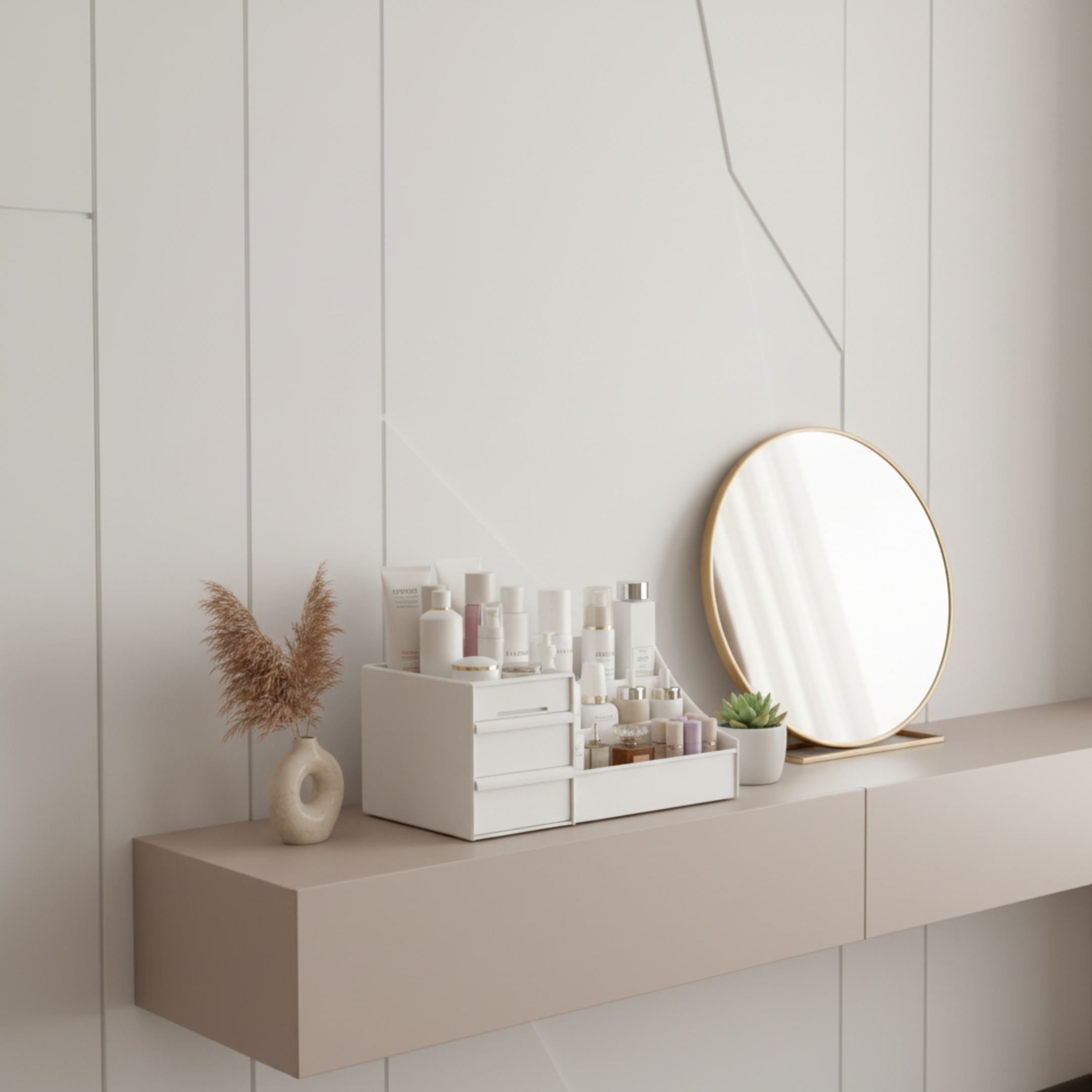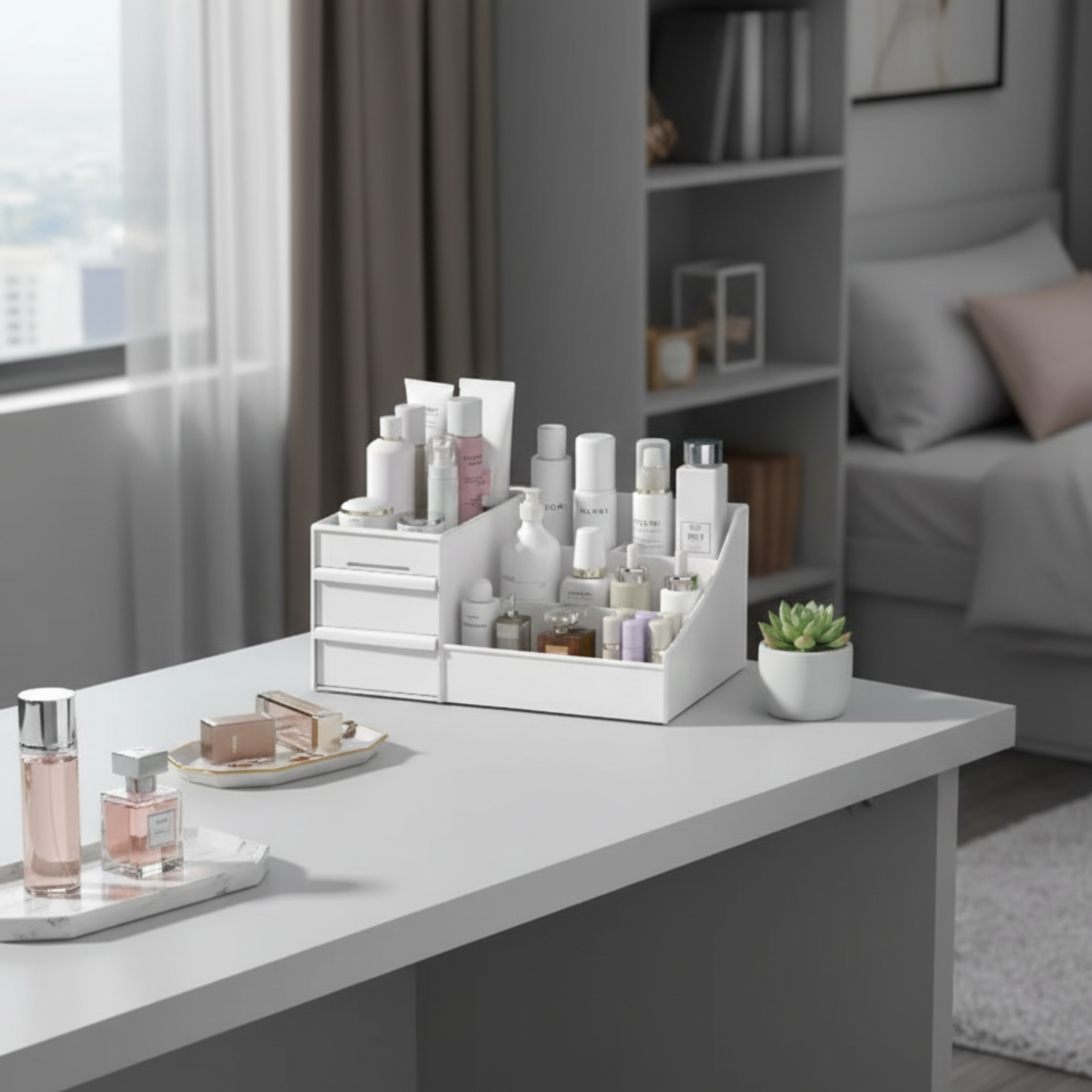 Keep your dressing table pristine and clutter-free with this White Drawer Makeup Storage Box, the perfect solution for organising cosmetics, skincare, and accessories in style. Its sleek modern design complements any décor — from chic dorm rooms to contemporary vanity setups. With spacious compartments and smooth-gliding drawers, everything you need is right at your fingertips.
