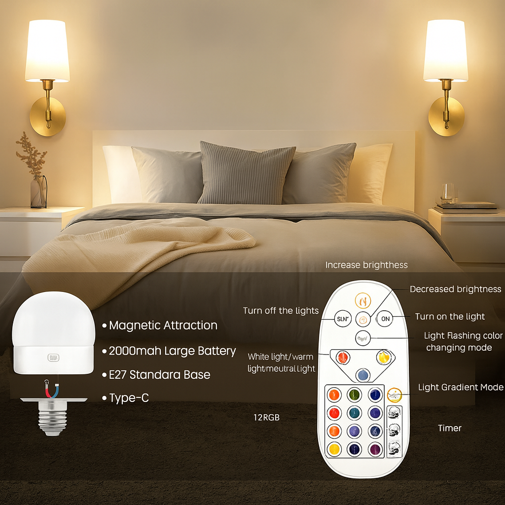Each lamp is powered by a rechargeable LED bulb offering adjustable brightness, colour options, and timer functions. Whether you need warm ambient light for relaxation, bright illumination for reading, or a splash of colour for atmosphere, this lamp does it all. Easy to install and simple to control via remote or touch, it’s the perfect solution for effortless, beautiful home lighting. Upgrade your space today and light up every moment with style.