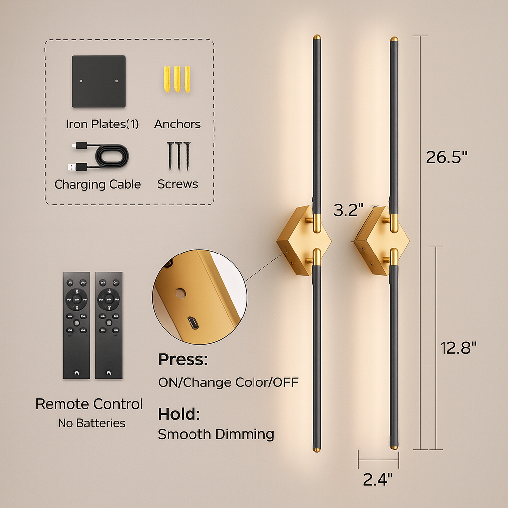 Transform your space with the Rechargeable Wireless Wall Lamp, where modern design meets practical innovation. Featuring a sleek, gold-accented frame and a slimline body, this elegant fixture blends seamlessly with any interior—whether it’s the living room, bedroom, hallway, or even a stylish workspace. With its rechargeable ultra-long-life battery, you’ll enjoy effortless lighting without the hassle of wires or constant replacements.