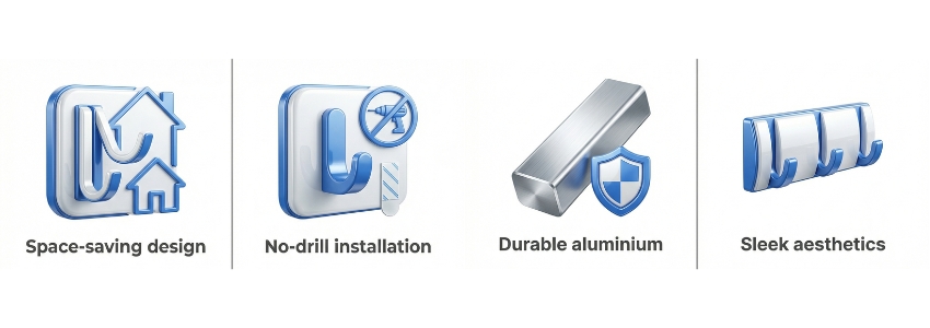 - Space-Saving Design: Hooks fold completely flat against the wall when not in use.
