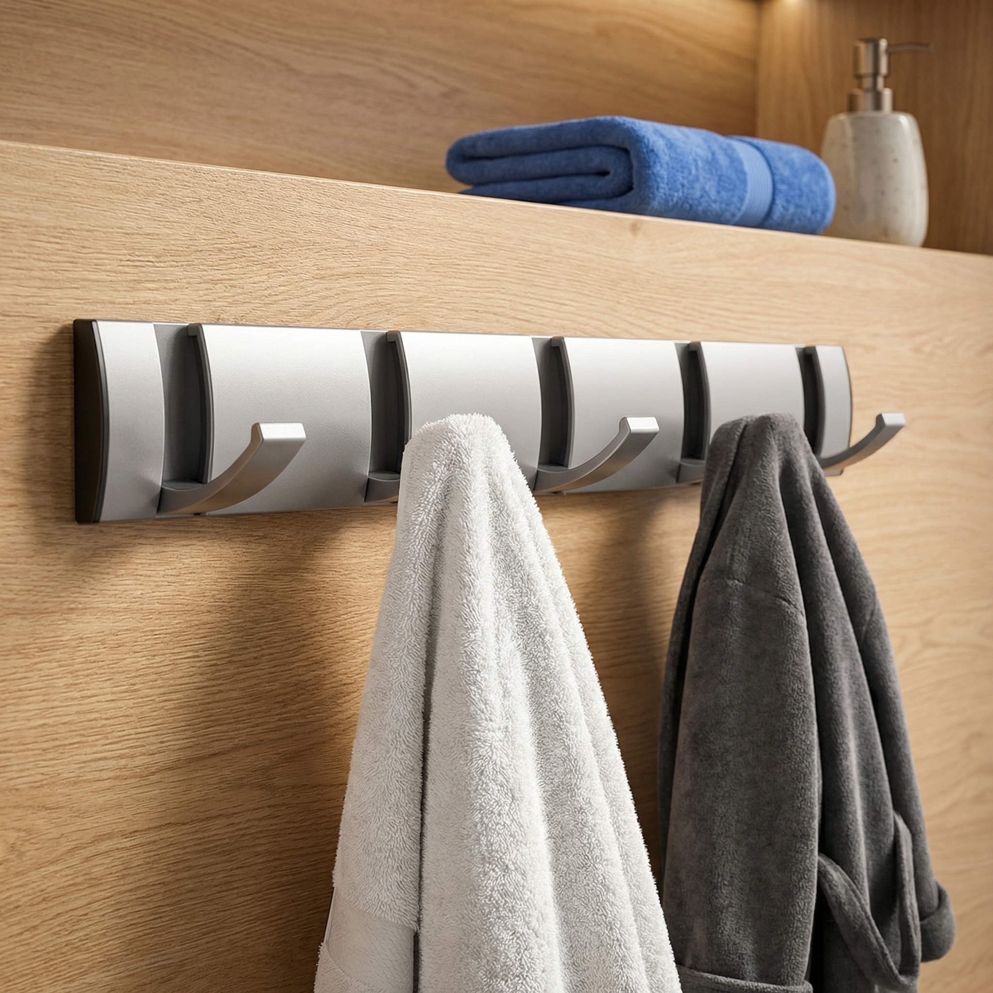 - The Bathroom: A rust-proof solution for drying towels and hanging robes safely.