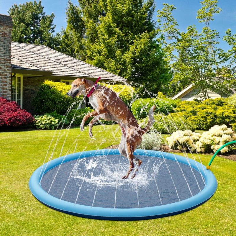Beat the summer heat with this 150/170cm Inflatable Pet Swimming Pool, the ultimate outdoor cooling toy for your furry friend! Made from thickened, non-toxic PVC, this splash pad features a built-in sprinkler system that creates a refreshing water playground—perfect for keeping dogs cool in gardens, beaches, or backyards. The quick-drain design and anti-slip surface ensure safe, mess-free fun, while the spiral-lock connectors prevent leaks.