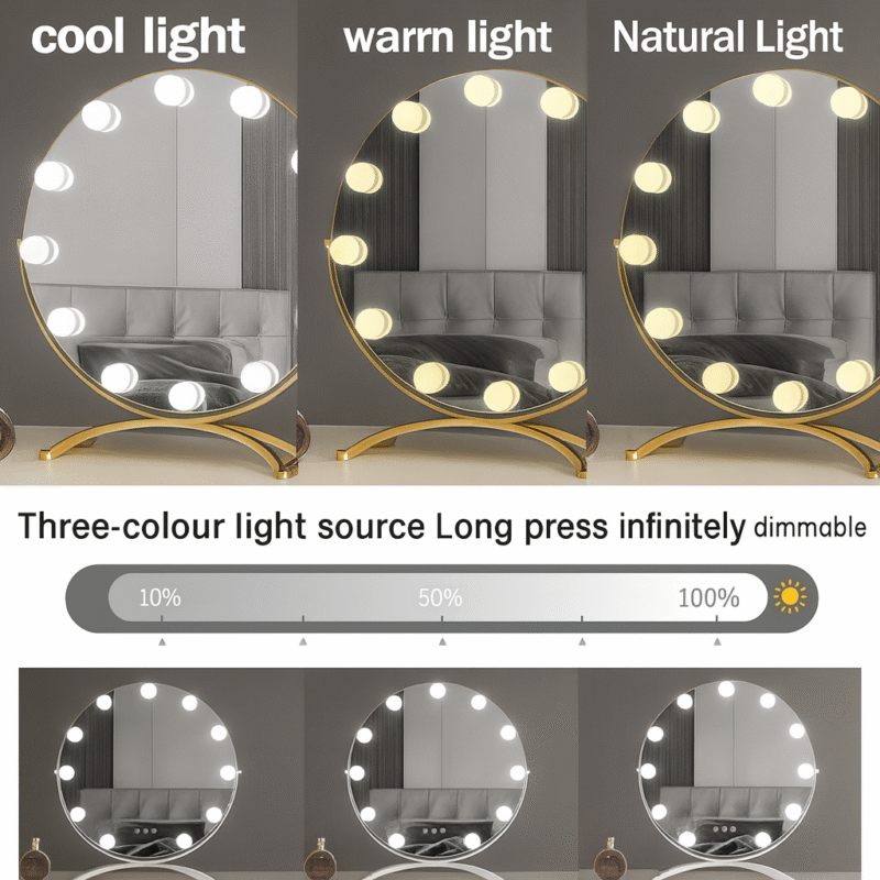 Transform your daily beauty routine with Our Makeup Mirror with Lights – where style meets precision. This stunning vanity mirror, framed in sleek metal and illuminated with premium LED bulbs, delivers crystal-clear reflection for flawless makeup application. Whether you’re getting ready for work, a special night out, or filming beauty content, it ensures perfect lighting every time.