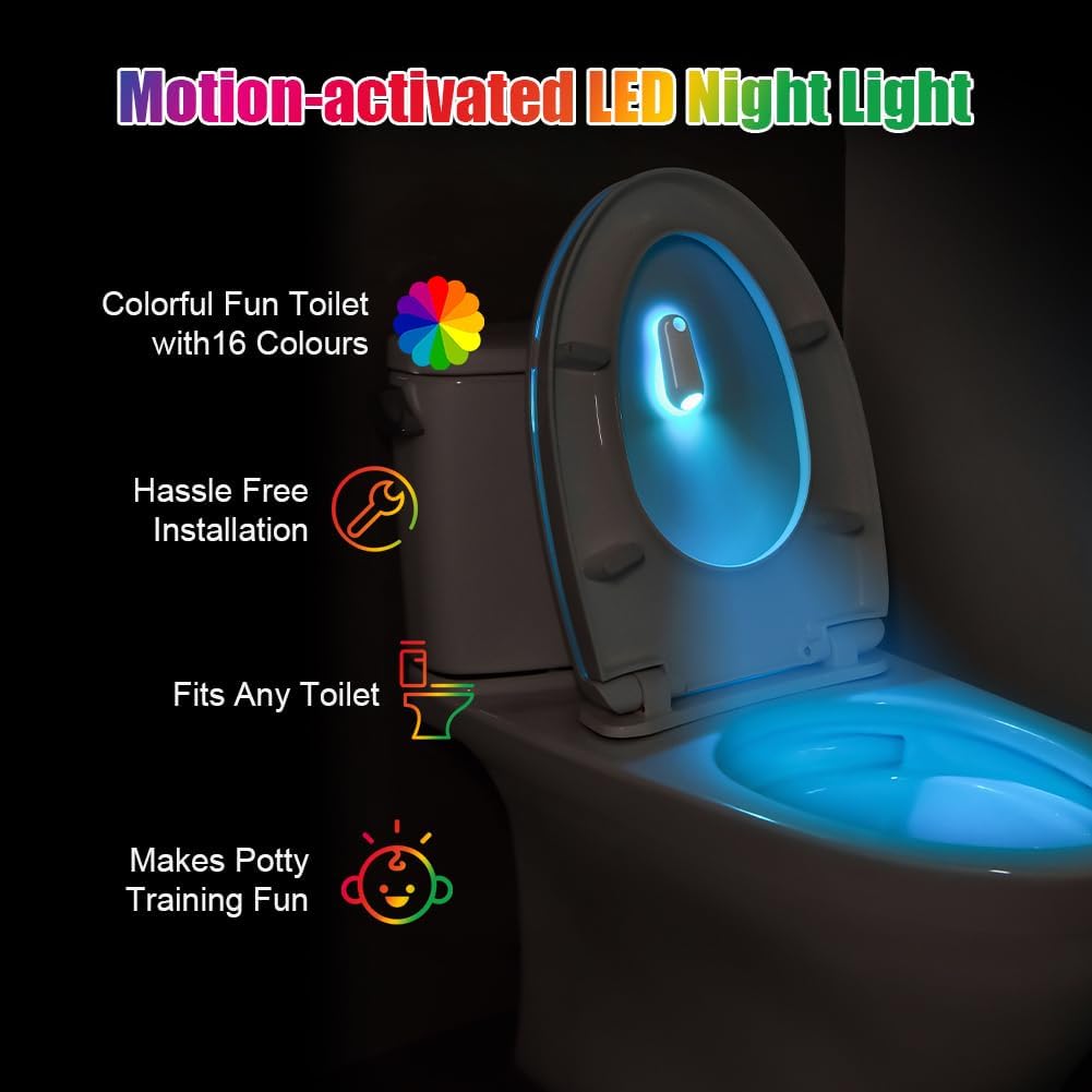 Transform your nightly bathroom trips with the GlowSmart Toilet Night Light, the clever LED light that automatically illuminates your toilet bowl with a soft, colourful glow. Designed with motion-sensing technology, it switches on the moment you approach — no fumbling for light switches or being blinded by harsh bathroom lights.
