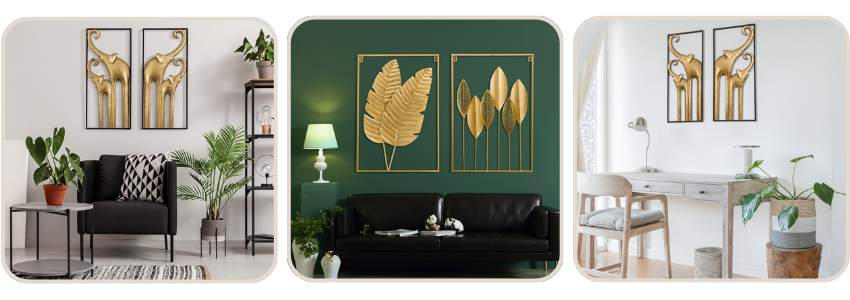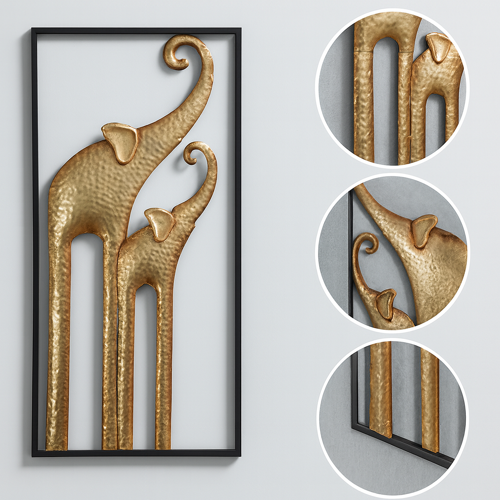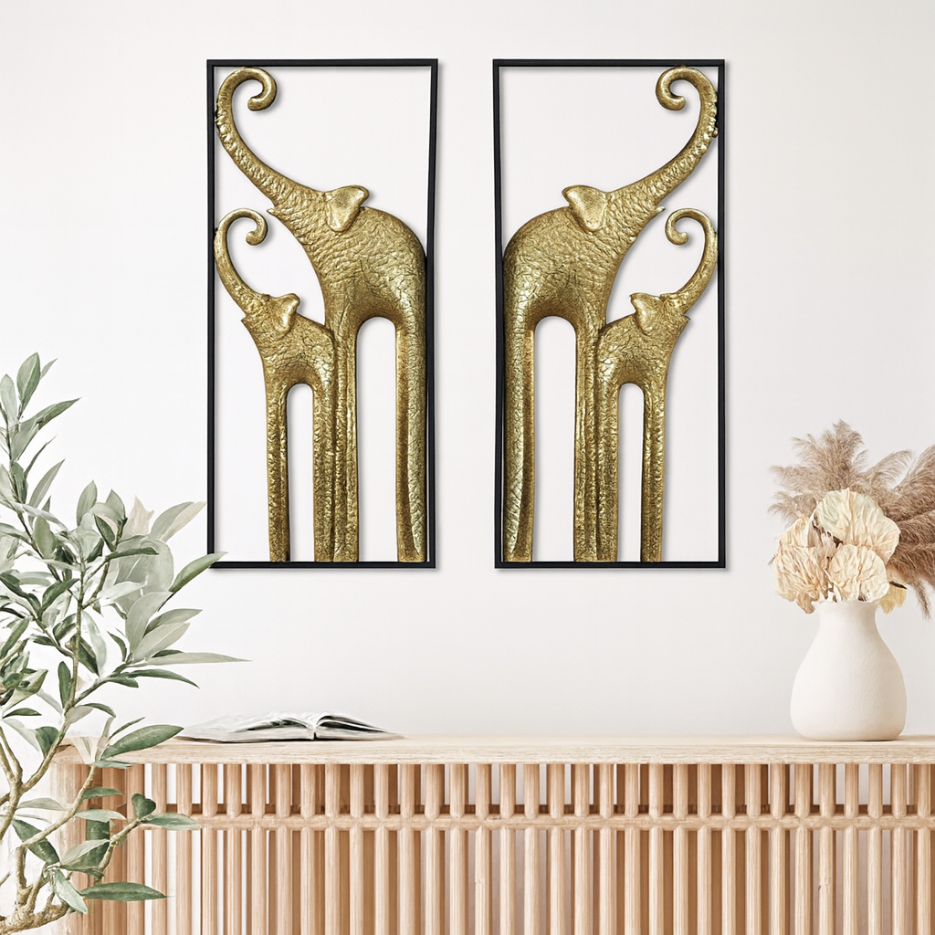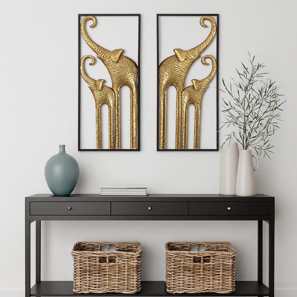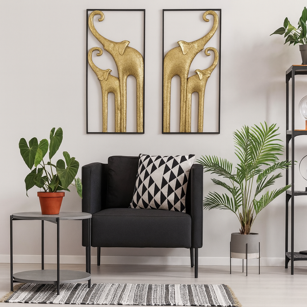 Bring timeless beauty and cultural charm into your home with our Set of 2 Gold Elephant Wall Decor. Handcrafted with a modern artistic touch, these elegant elephant figures are framed in sleek black borders, making them a captivating focal point for your living room, bedroom, hallway, or even office. Their shimmering gold finish reflects light beautifully, instantly brightening any wall and adding sophistication to your interiors.