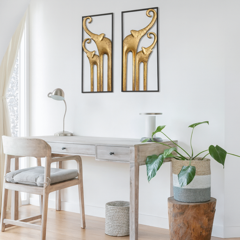 Bring timeless beauty and cultural charm into your home with our Set of 2 Gold Elephant Wall Decor. Handcrafted with a modern artistic touch, these elegant elephant figures are framed in sleek black borders, making them a captivating focal point for your living room, bedroom, hallway, or even office. Their shimmering gold finish reflects light beautifully, instantly brightening any wall and adding sophistication to your interiors.