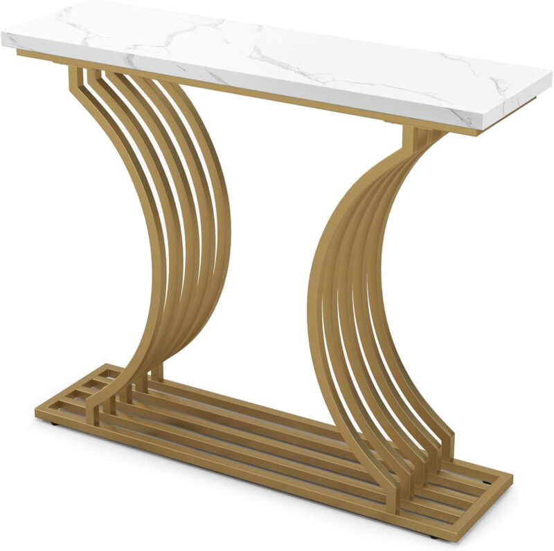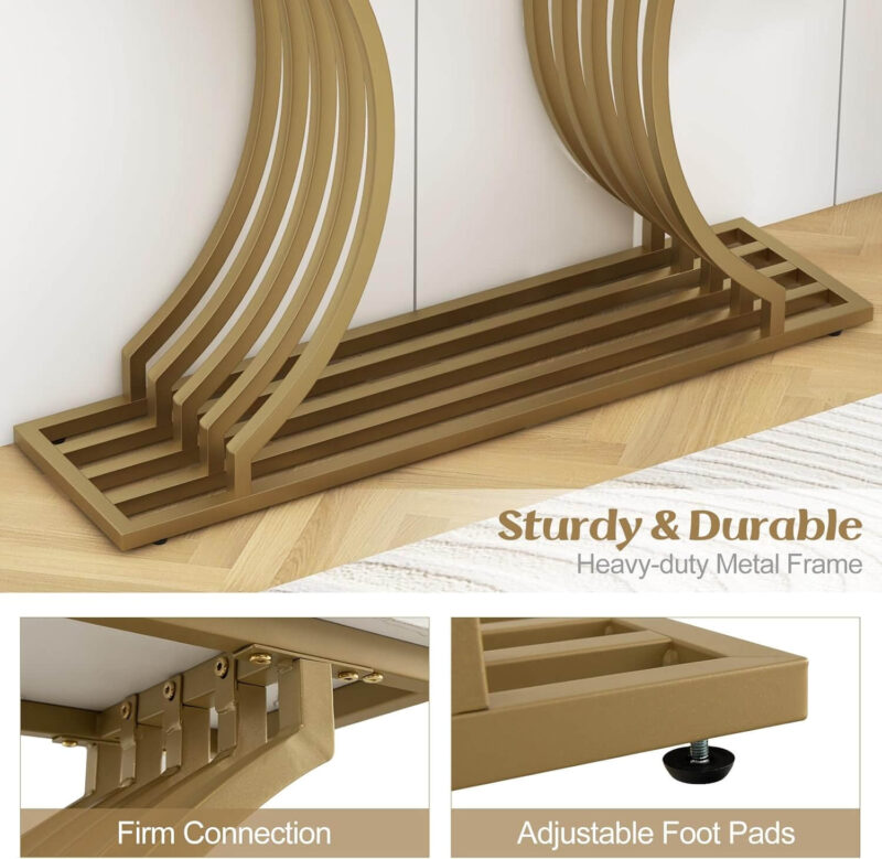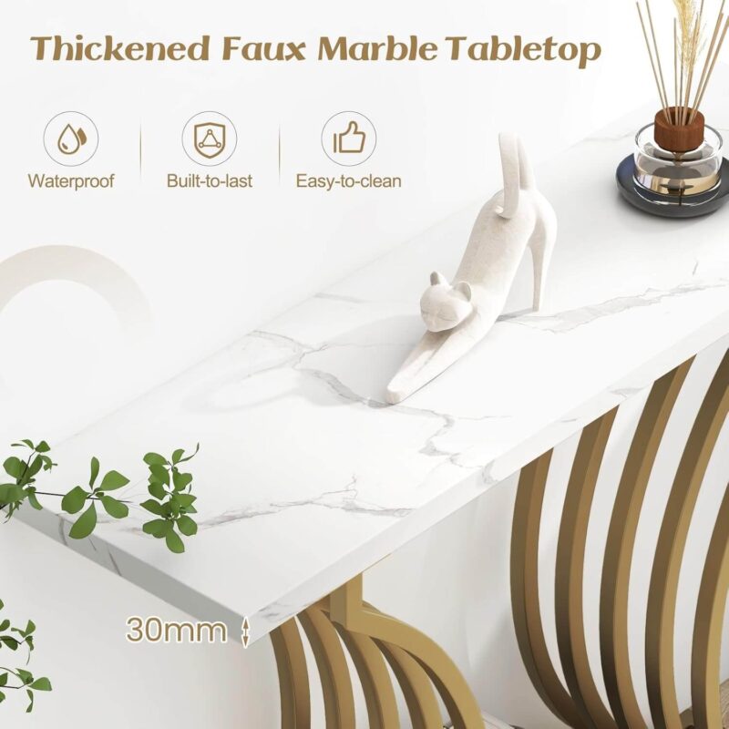 Elevate your living space with the 39″ Console Table, a perfect blend of luxury and functionality. Featuring a sophisticated white faux marble tabletop and a sleek V-shaped gold metal base, this console table is designed to make a bold statement in any home.