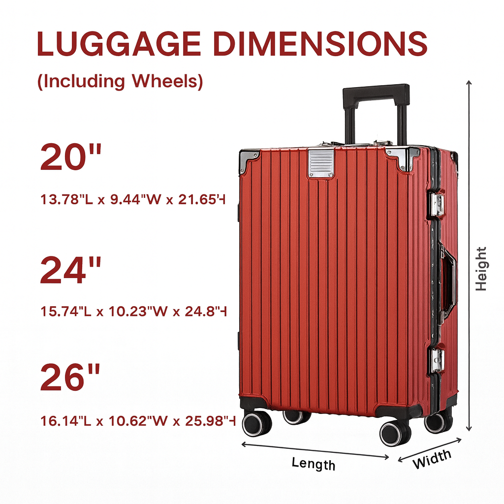 - Sizes Available: 20” (carry-on), 24” and 26” (checked baggage)