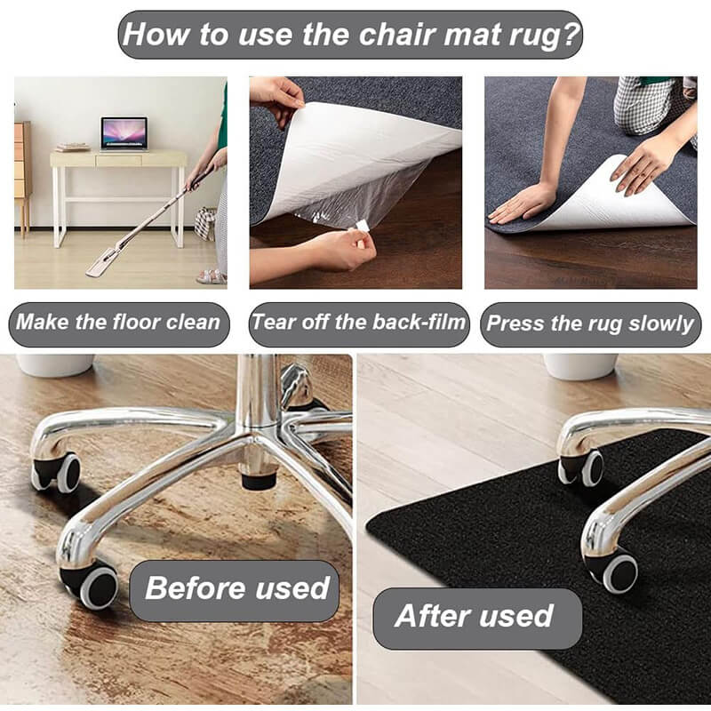 Give your office space a practical upgrade. Our chair mat is designed for versatility; it can be custom cut to fit any area, serving as a protective layer under kitchen chairs, dining tables, or gym equipment. Cleaning is a breeze—simply peel, place, and press to secure it in position, and enjoy a pristine workspace that fosters productivity and comfort.
