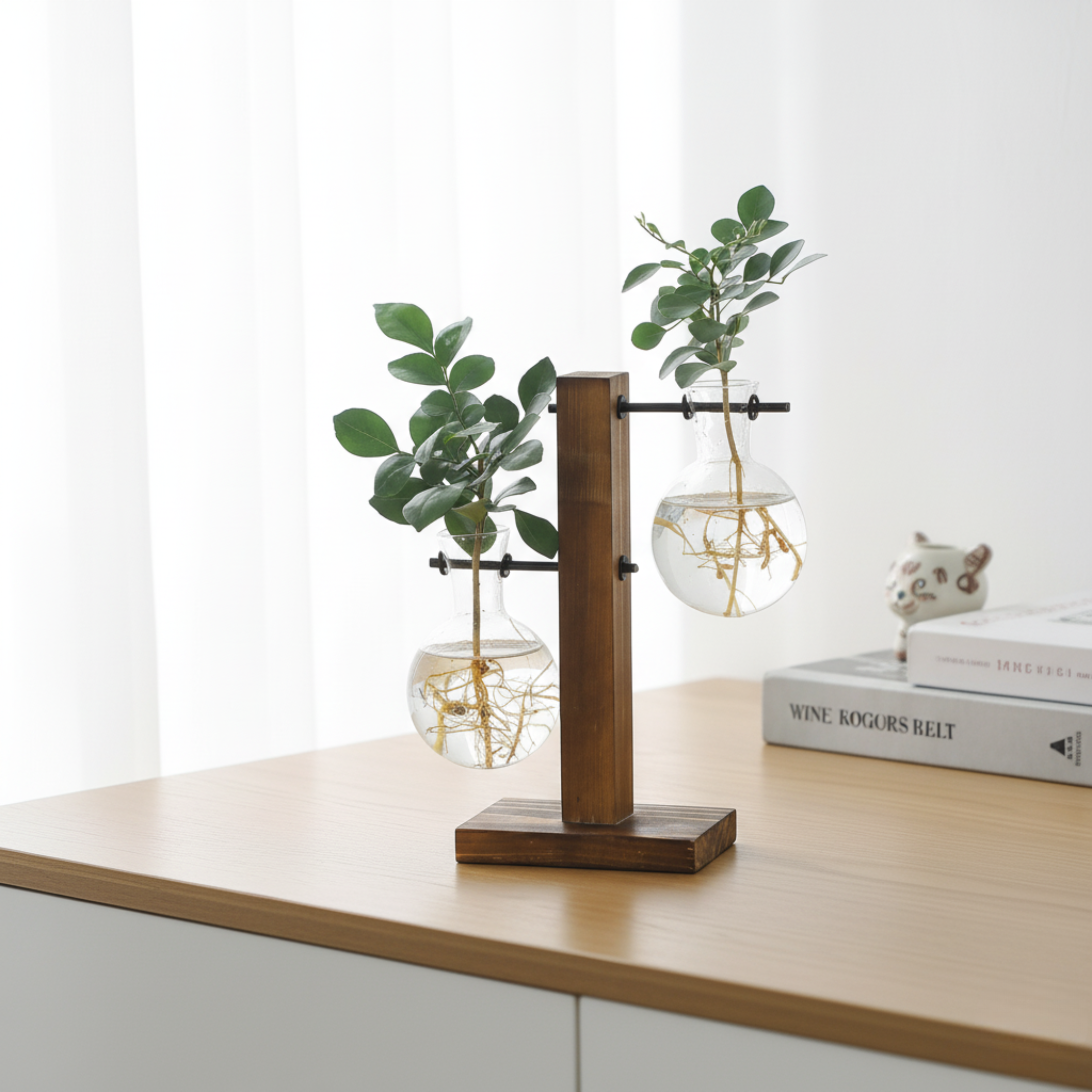 Bring a touch of nature and sophistication to your space with the Creative Glass Desktop Planter Bulb Vase. Featuring delicate glass bulb vases suspended on a handcrafted wooden stand, this elegant piece adds a calming, botanical charm to any desk, shelf, or windowsill. Perfect for propagating plants, showcasing cut flowers, or creating minimalist water gardens — it’s where creativity meets natural beauty.