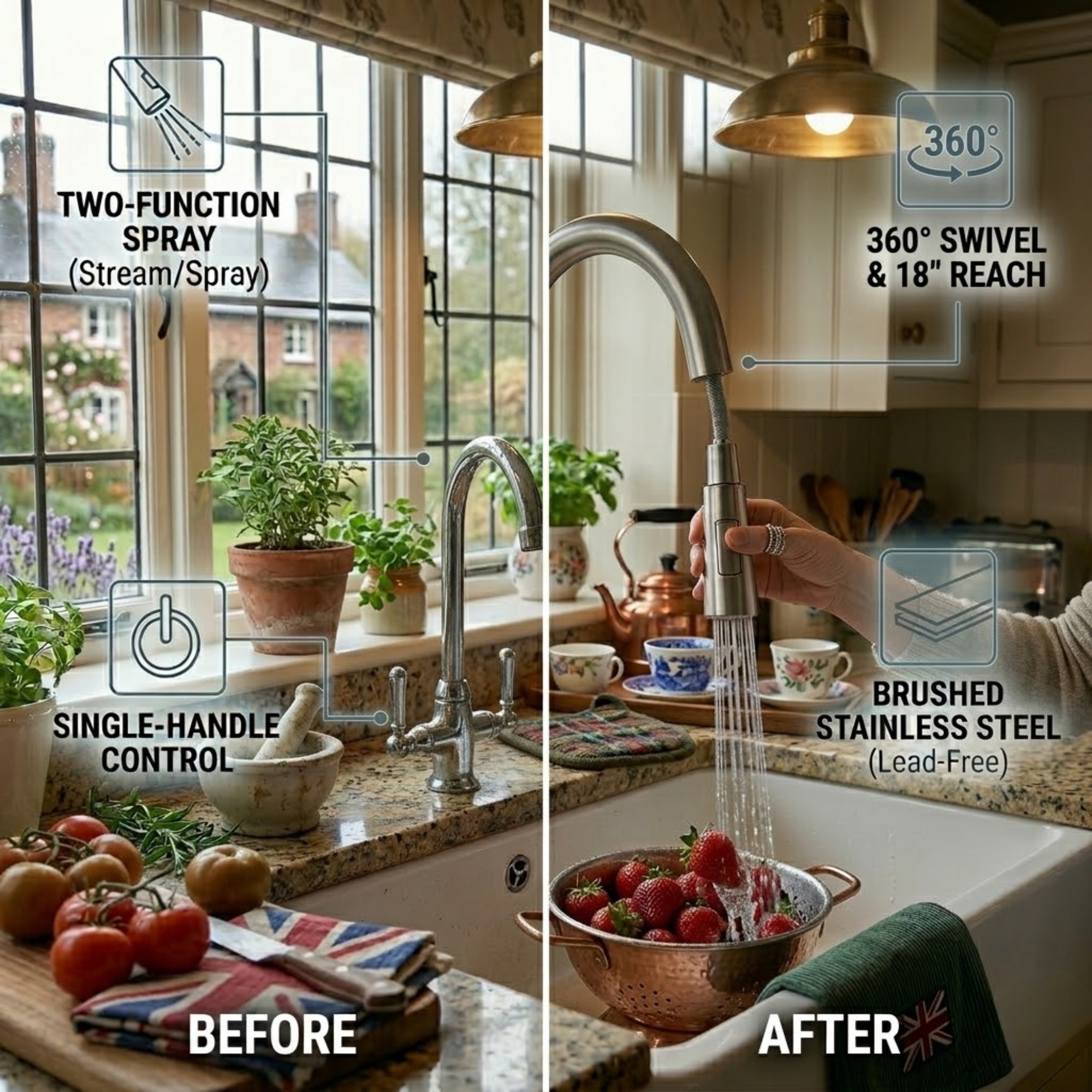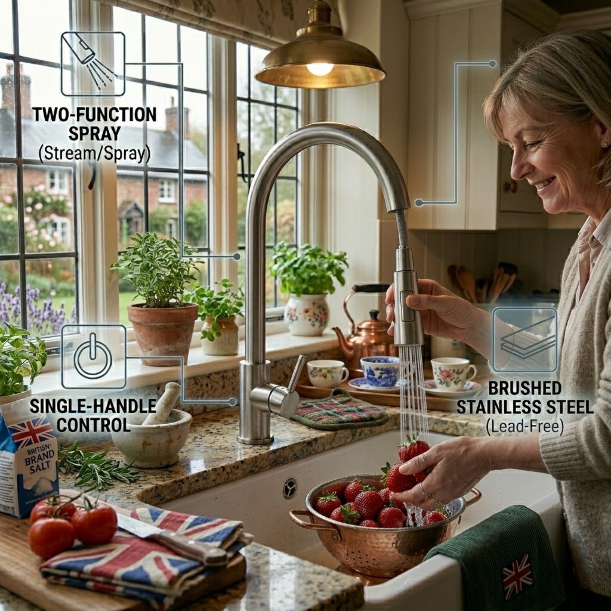 Experience the convenience of dual-mode water flow, switching between aerated stream and powerful spray at the touch of a button. Our gravity-retract hose glides smoothly, making cleaning large pots or rinsing vegetables effortless. Designed for quick DIY installation, this tap meets standard UK requirements, providing a sleek, high-end aesthetic without the premium showroom price tag.