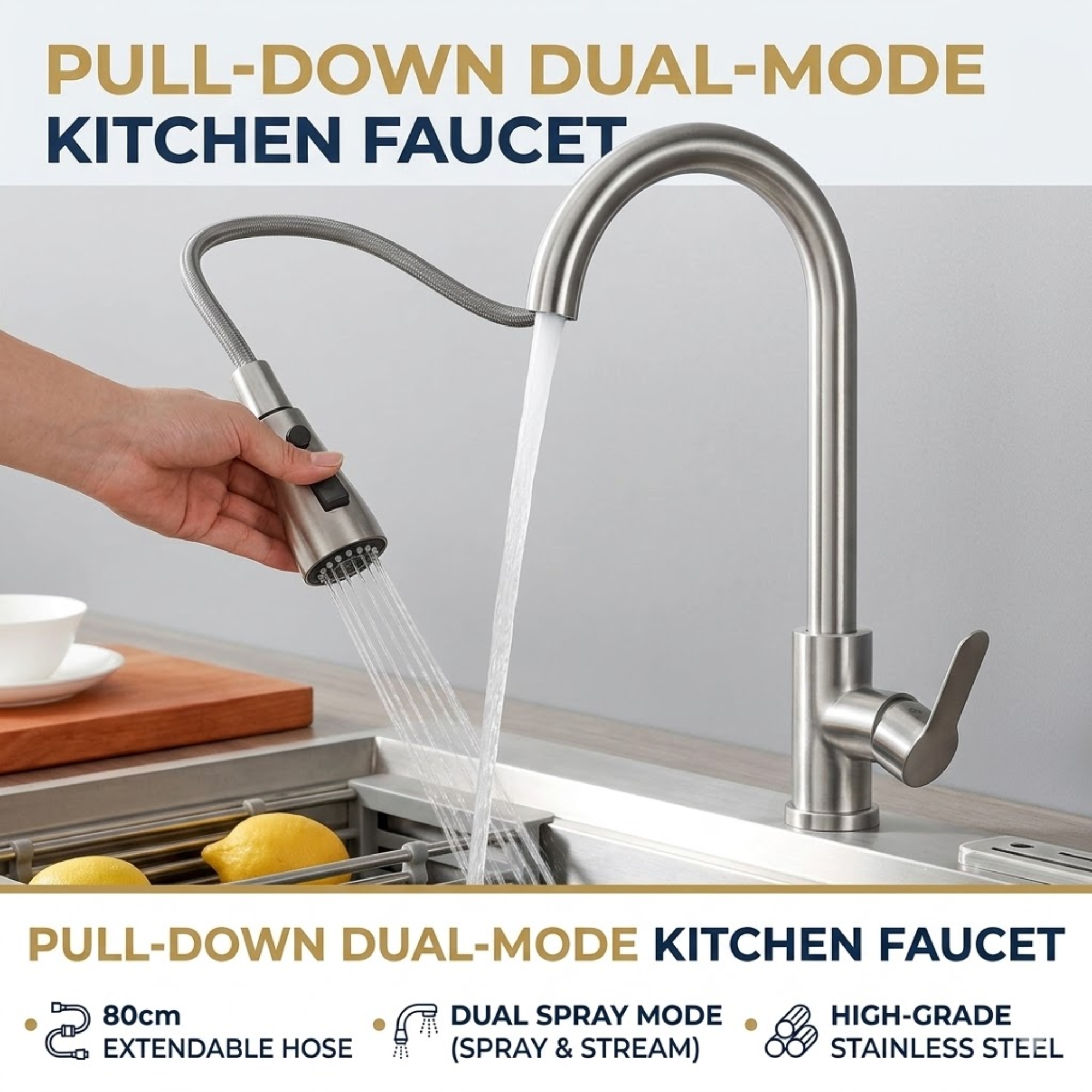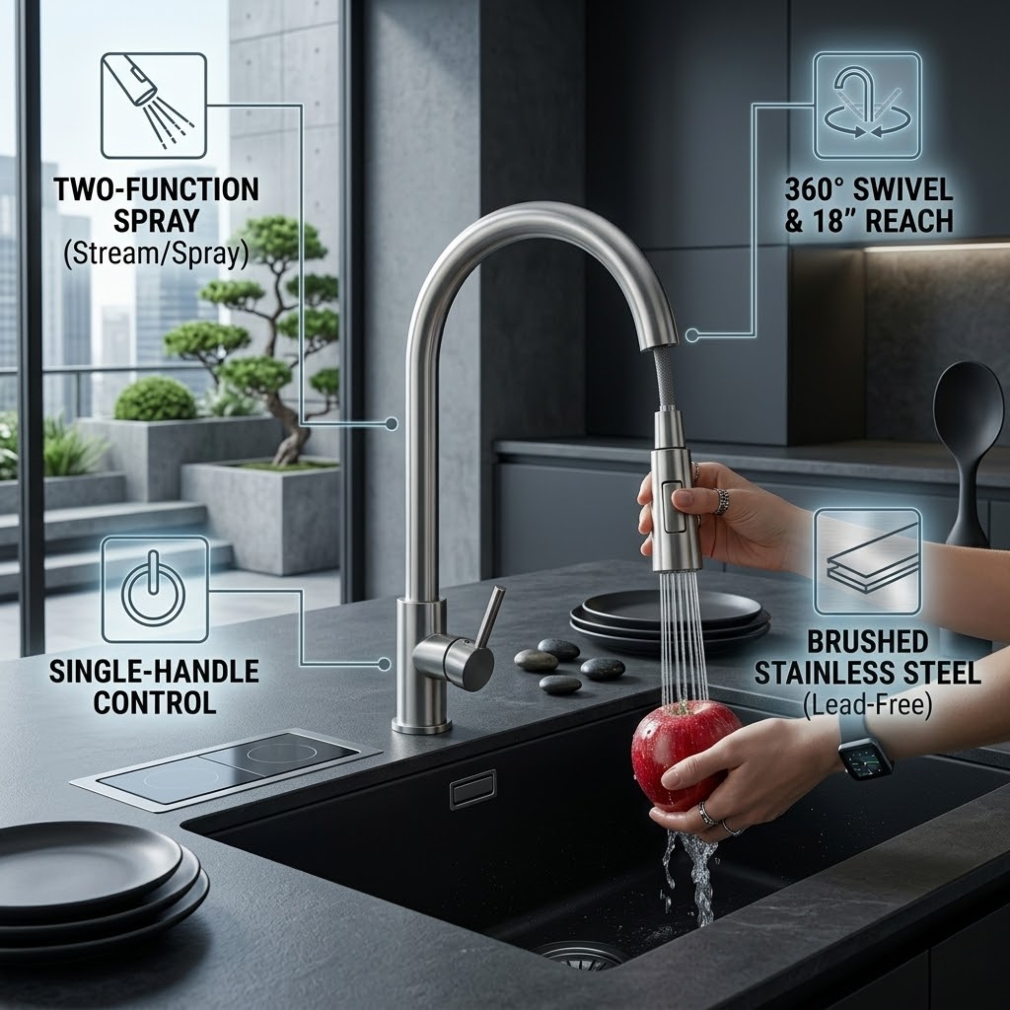 - Features & Performance: 360-degree swivel spout; Dual-function spray head; Ceramic cartridge.