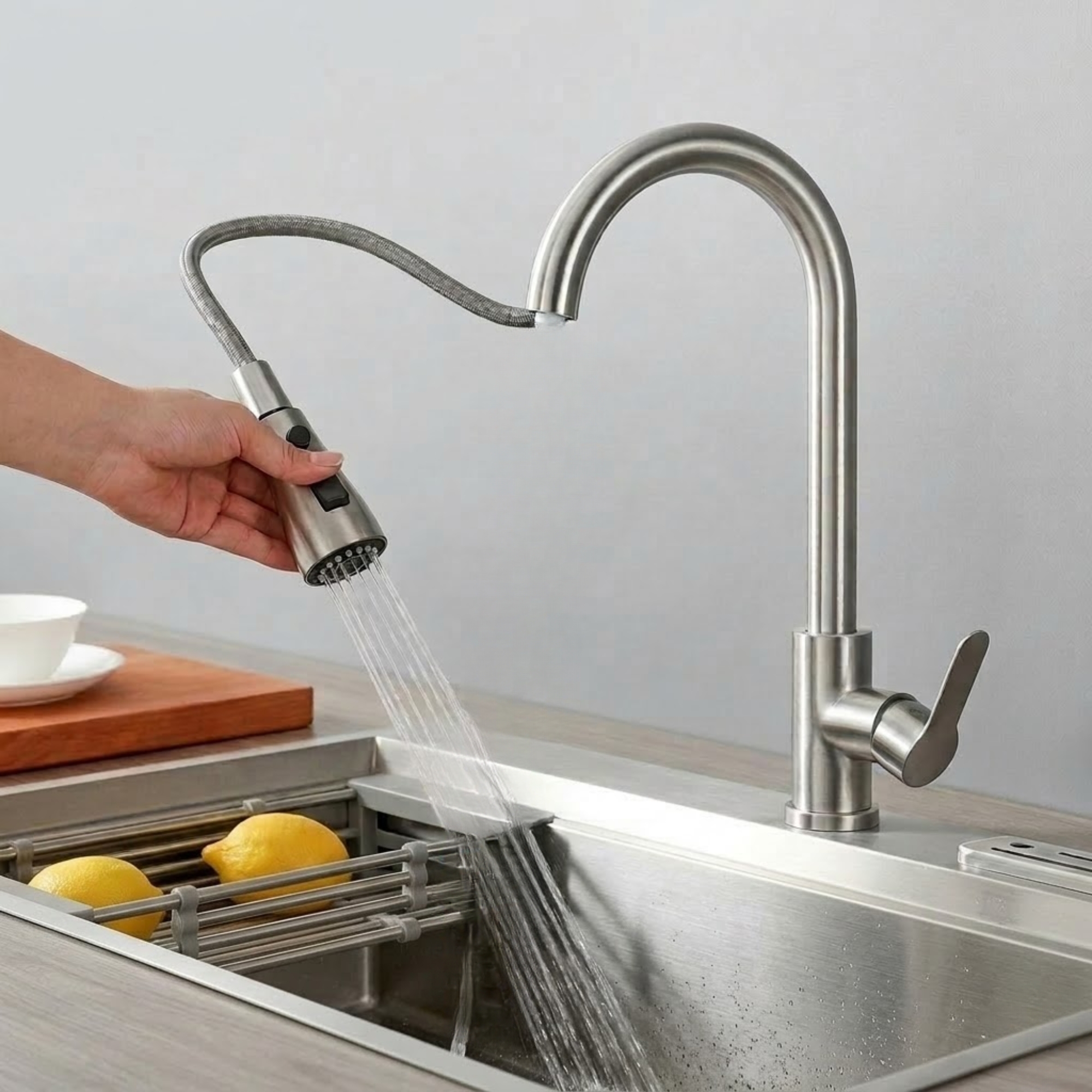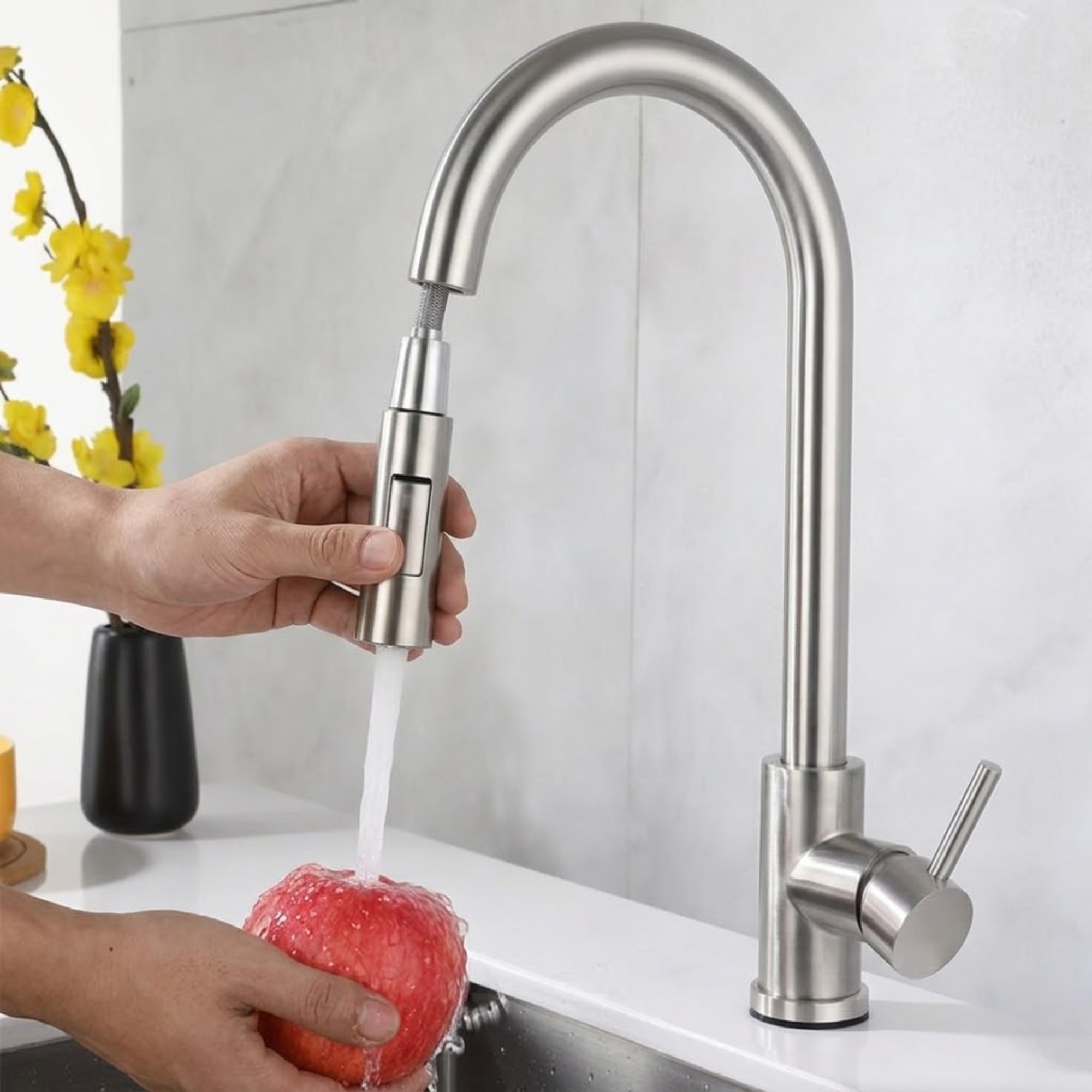 Transform your kitchen with the Kydra Professional Tap, featuring a high-arc spout and retractable pull-out spray for ultimate versatility. Crafted from high-grade stainless steel with a brushed nickel finish, it combines designer luxury with everyday durability. This UK-standard monobloc mixer ensures effortless temperature control and long-lasting, drip-free performance for any modern sink setup.
