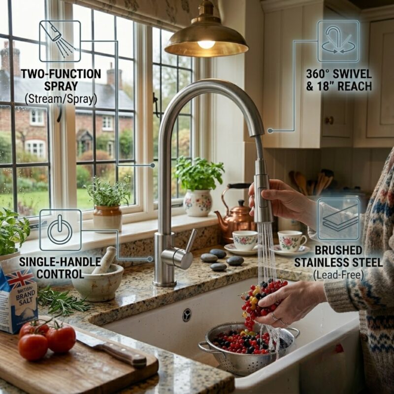 - Features & Performance: 360-degree swivel spout; Dual-function spray head; Ceramic cartridge.