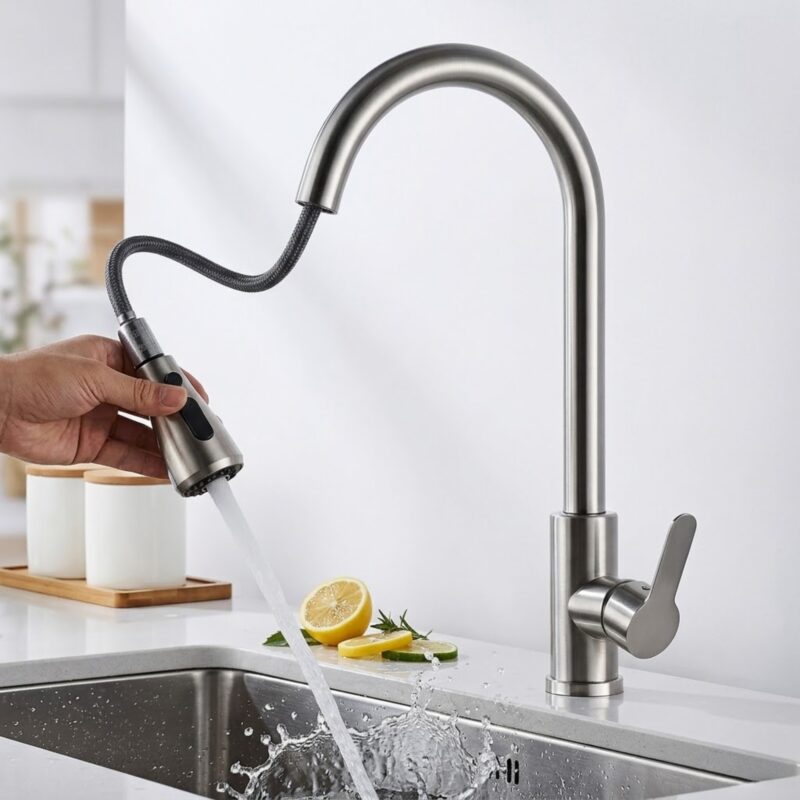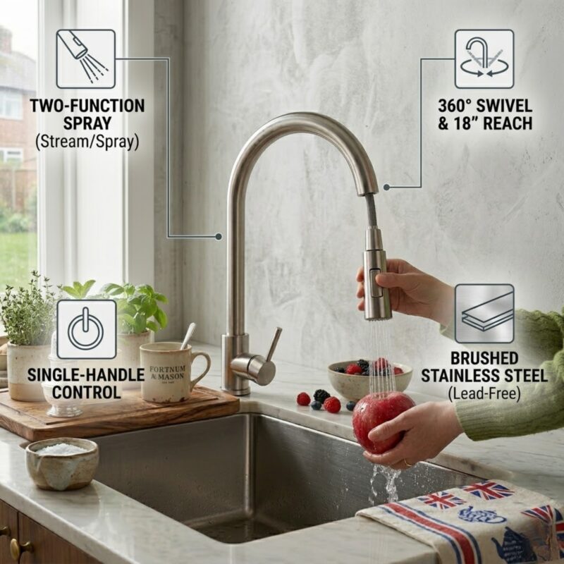 Transform your kitchen with the Kydra Professional Tap, featuring a high-arc spout and retractable pull-out spray for ultimate versatility. Crafted from high-grade stainless steel with a brushed nickel finish, it combines designer luxury with everyday durability. This UK-standard monobloc mixer ensures effortless temperature control and long-lasting, drip-free performance for any modern sink setup.