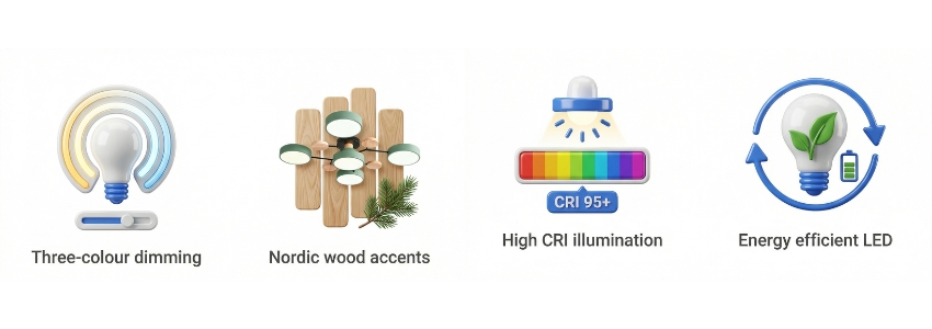 Enhance your home’s aesthetic with the LumaNord Modern LED Chandelier. Crafted from a premium metal and wood blend, this stylish fixture provides a minimalist Scandinavian feel. Featuring three-colour dimmable settings, you can effortlessly switch between warm white and cool white to suit any mood, ensuring your living room or bedroom is always perfectly illuminated.
