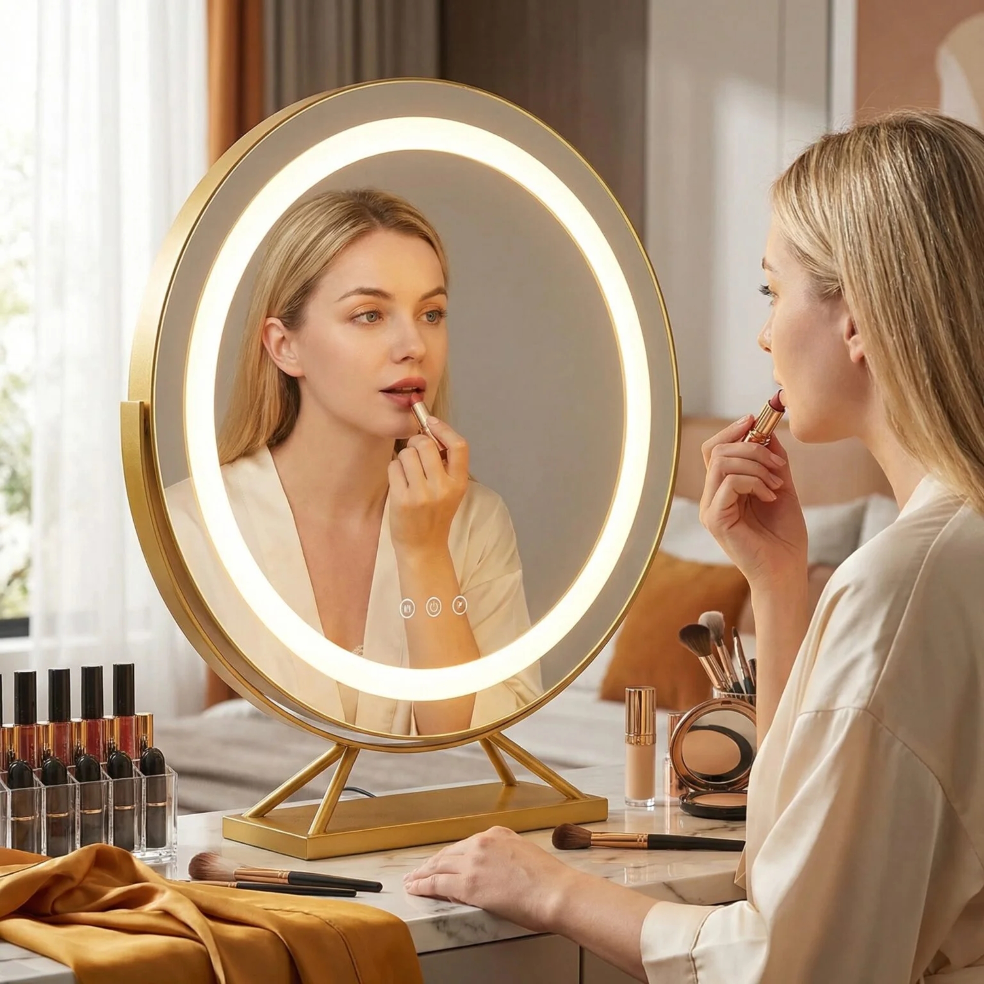 The LumeNova LED Vanity Mirror transforms your dressing table into a professional beauty studio. This illuminated dressing table mirror provides flawless lighting for makeup application and skincare. Featuring distortion-free HD glass, it ensures every detail is visible. With its sleek metal frame, it adds modern luxury to any contemporary UK bedroom.