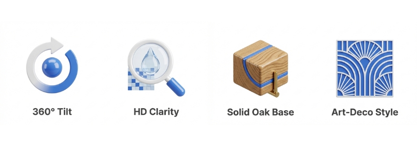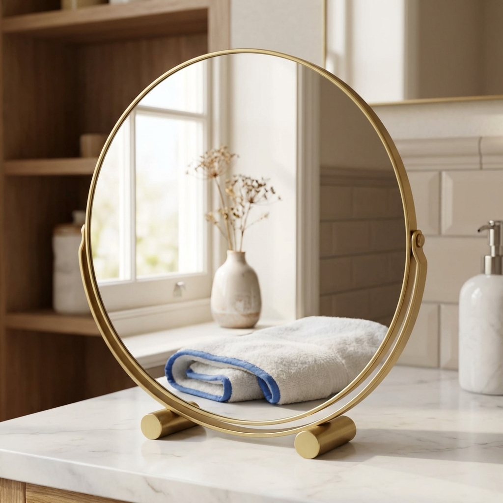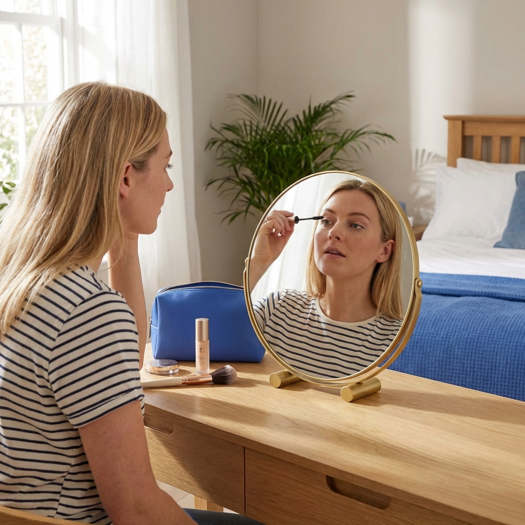 Experience total flexibility with a 360-degree rotating tilt, allowing you to capture the perfect light and angle. The solid oak base ensures a heavy, anti-slip foundation for total countertop security. Available in 30cm, 40cm, and 50cm, this durable dressing table mirror meets the highest UK quality standards for long-lasting daily use.