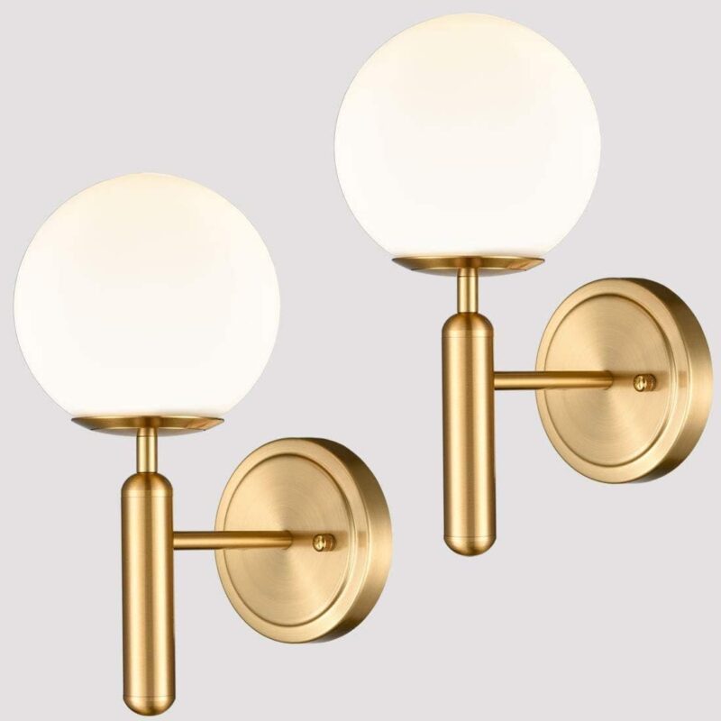 Crafted with meticulous attention to detail, this sconce set showcases a harmonious blend of brushed metal and frosted spherical shades. The contrast between the sleek brass gold frame and the soft, white opal glass shade creates a captivating interplay of modernity and retro charm. Whether installed upward or downward, these sconces add a layer of depth and style to any room, making them the perfect choice for mid-century, modern, or industrial décor.