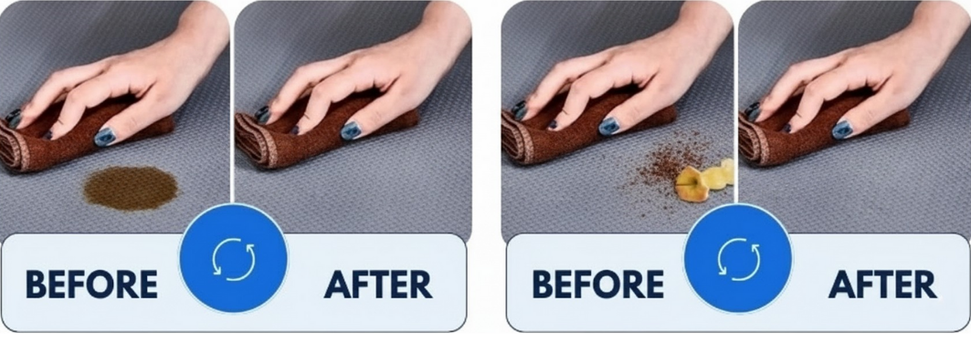 Simply wipe with a damp cloth or mild detergent — no scrubbing or machine washing needed. Spills bead on the surface, so they wipe away instantly.