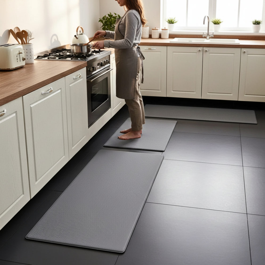 Blending smart design with daily comfort, this mat keeps your kitchen safer, cleaner and more inviting. The soft-touch surface absorbs impact and muffles noise, while the waterproof, wipe-clean finish makes spills disappear in seconds. Its slim, modern look fits any UK home – from cozy flats to open-plan family kitchens – offering a simple upgrade that instantly makes everyday life more comfortable and stress-free.