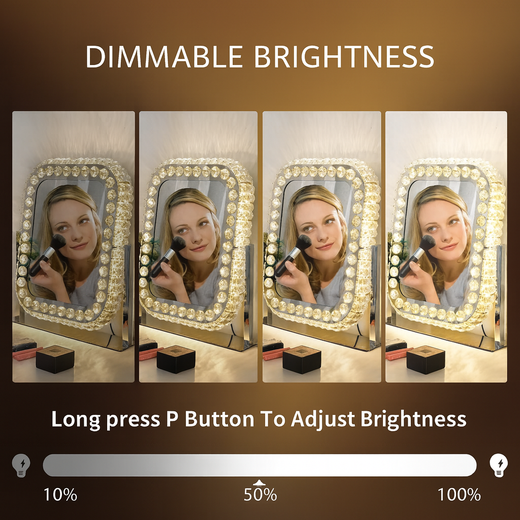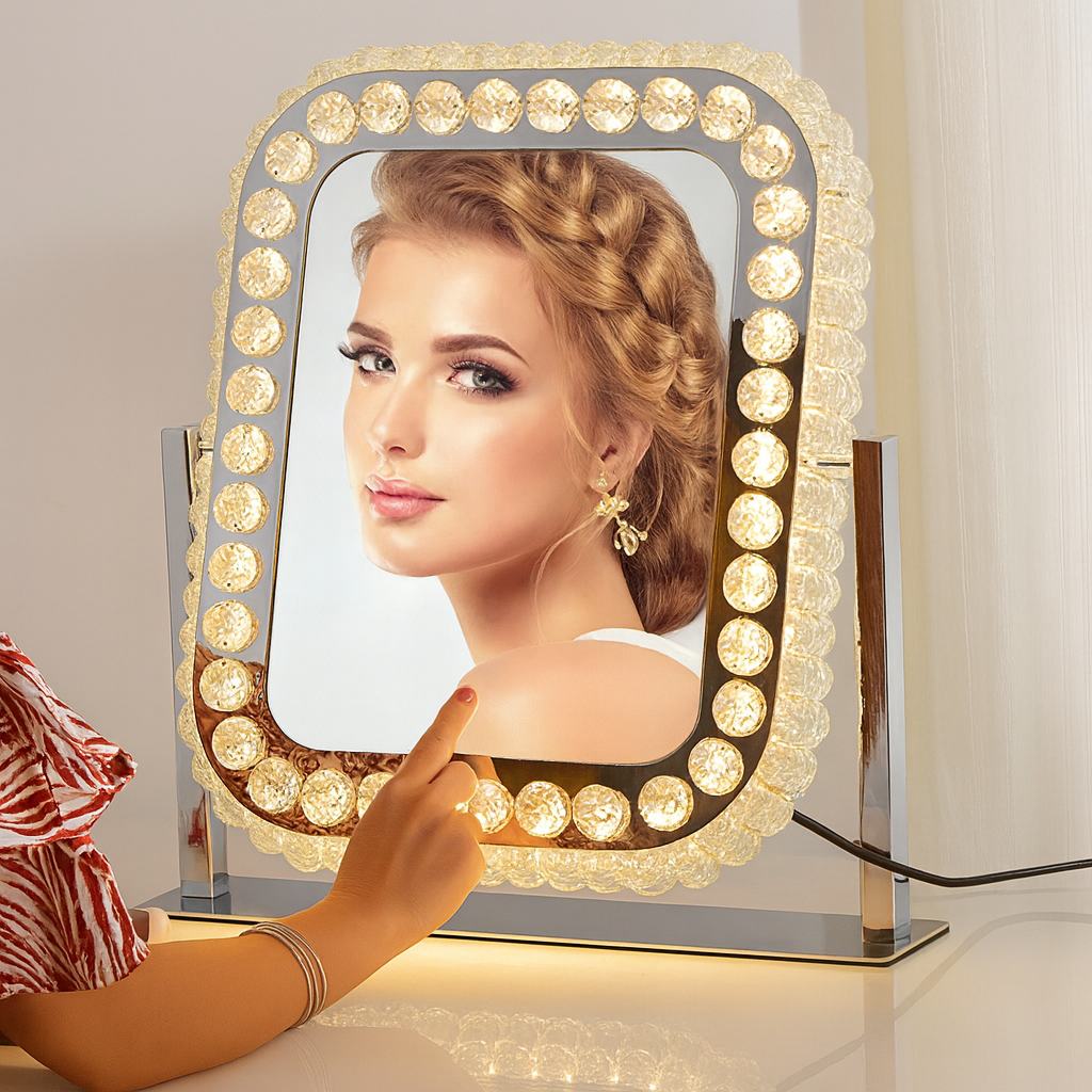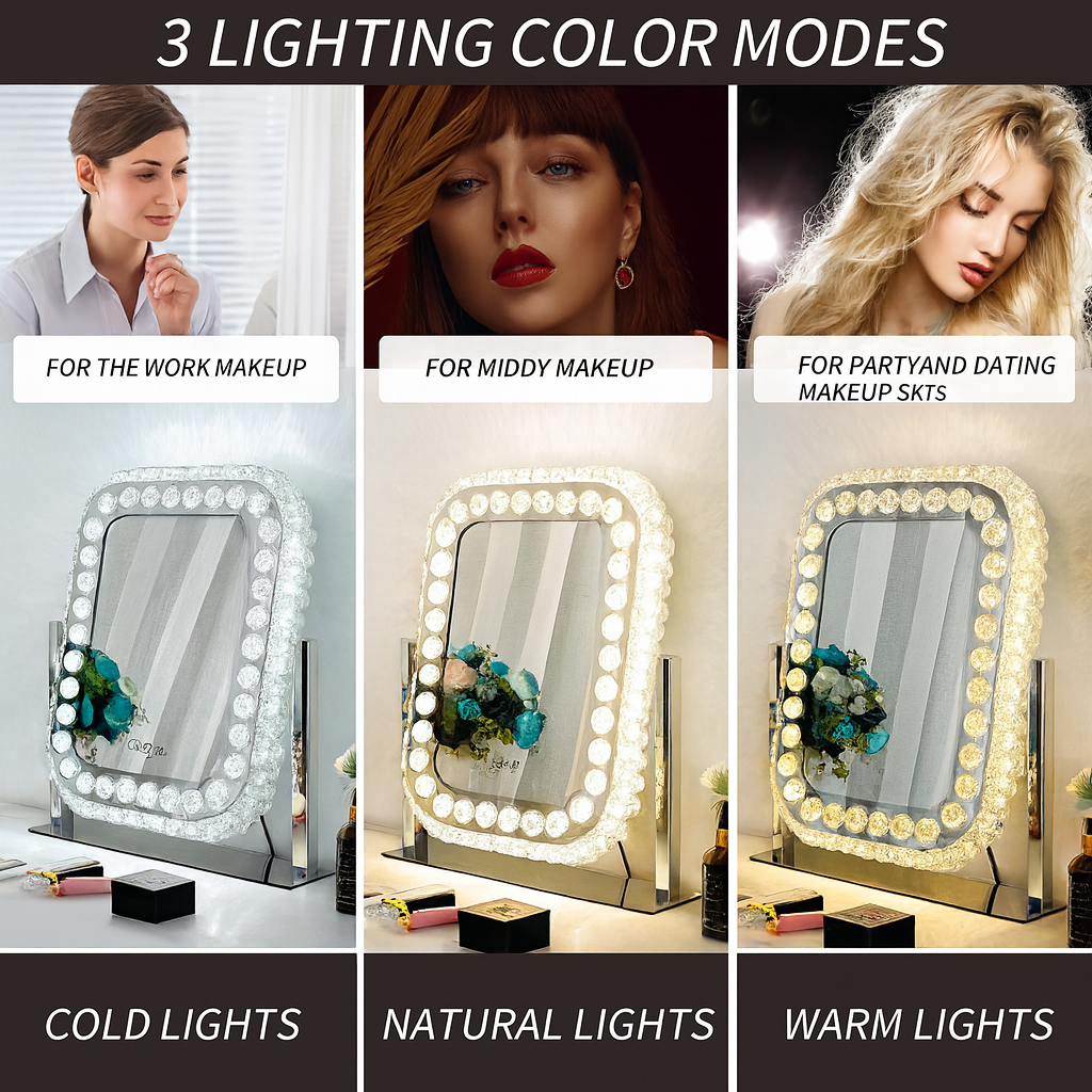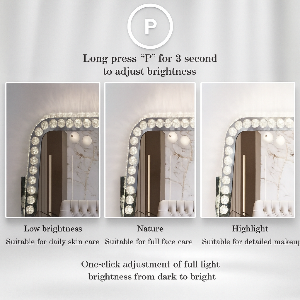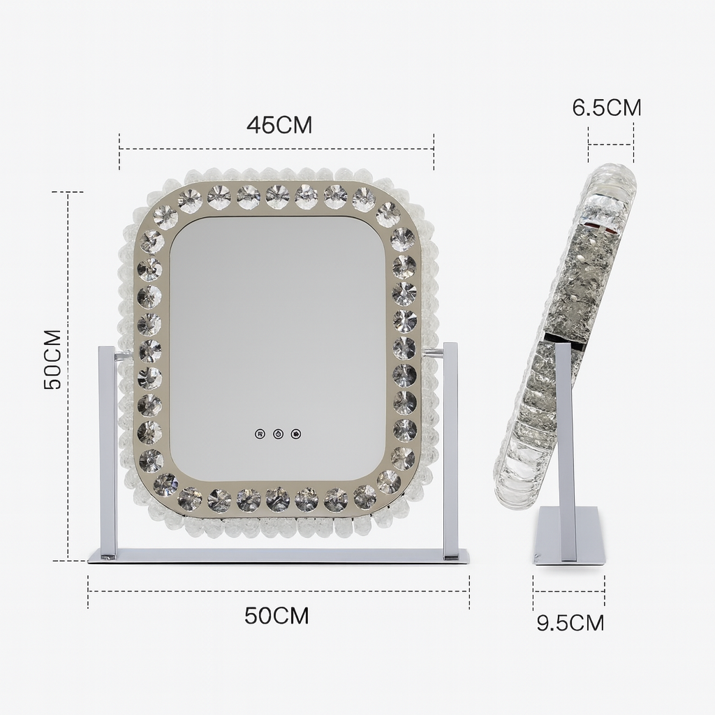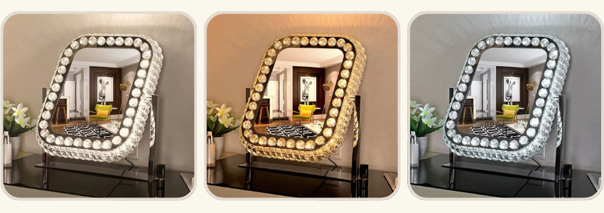 Bring glamour and precision to your daily beauty routine with our luxurious crystal LED vanity mirror. Featuring a dazzling frame of sparkling crystals, this modern yet timeless design adds a touch of elegance to any dressing table. The powerful LED lighting offers three tricolour modes warm, neutral, and cool to perfectly match any occasion, whether you’re getting ready for a candlelit dinner, a business meeting, or a night out with friends.