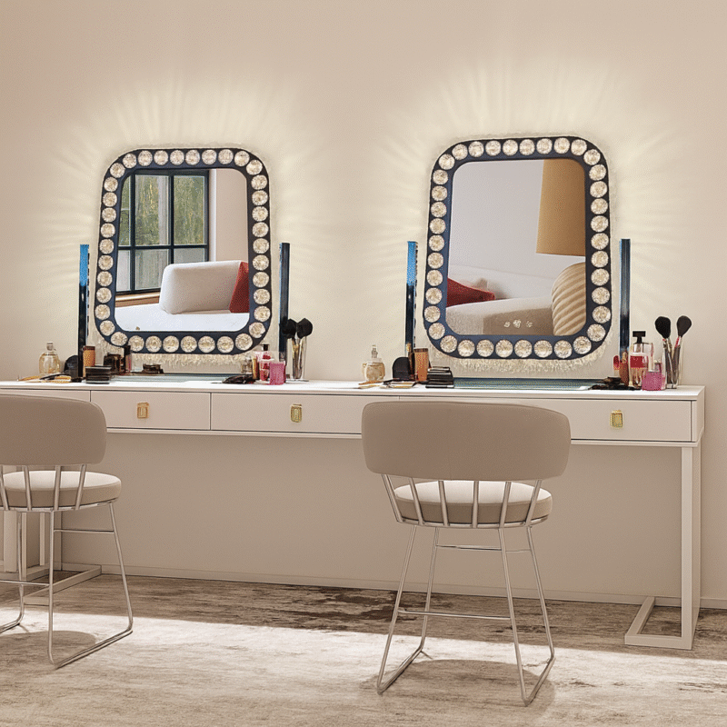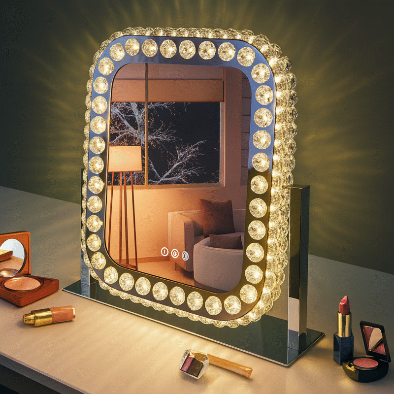 Bring glamour and precision to your daily beauty routine with our luxurious crystal LED vanity mirror. Featuring a dazzling frame of sparkling crystals, this modern yet timeless design adds a touch of elegance to any dressing table. The powerful LED lighting offers three tricolour modes warm, neutral, and cool to perfectly match any occasion, whether you’re getting ready for a candlelit dinner, a business meeting, or a night out with friends.