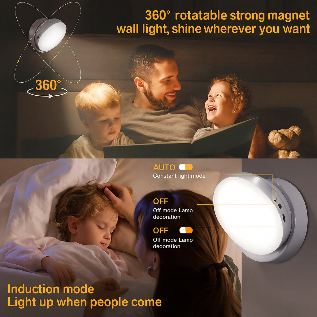Thanks to its magnetic base and 360° rotatable head, you can direct the beam exactly where you want it. Use it as a hands-free wall lamp, a portable torch, or a stylish wireless light for any room. Rechargeable by USB and designed with a sleek, modern look, this night light blends practicality with elegance making it an essential addition to your home lighting solutions.