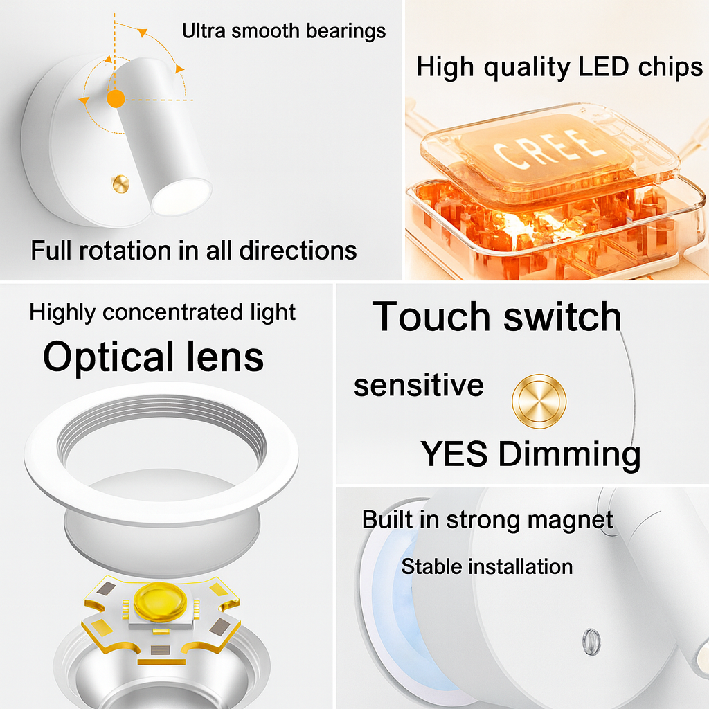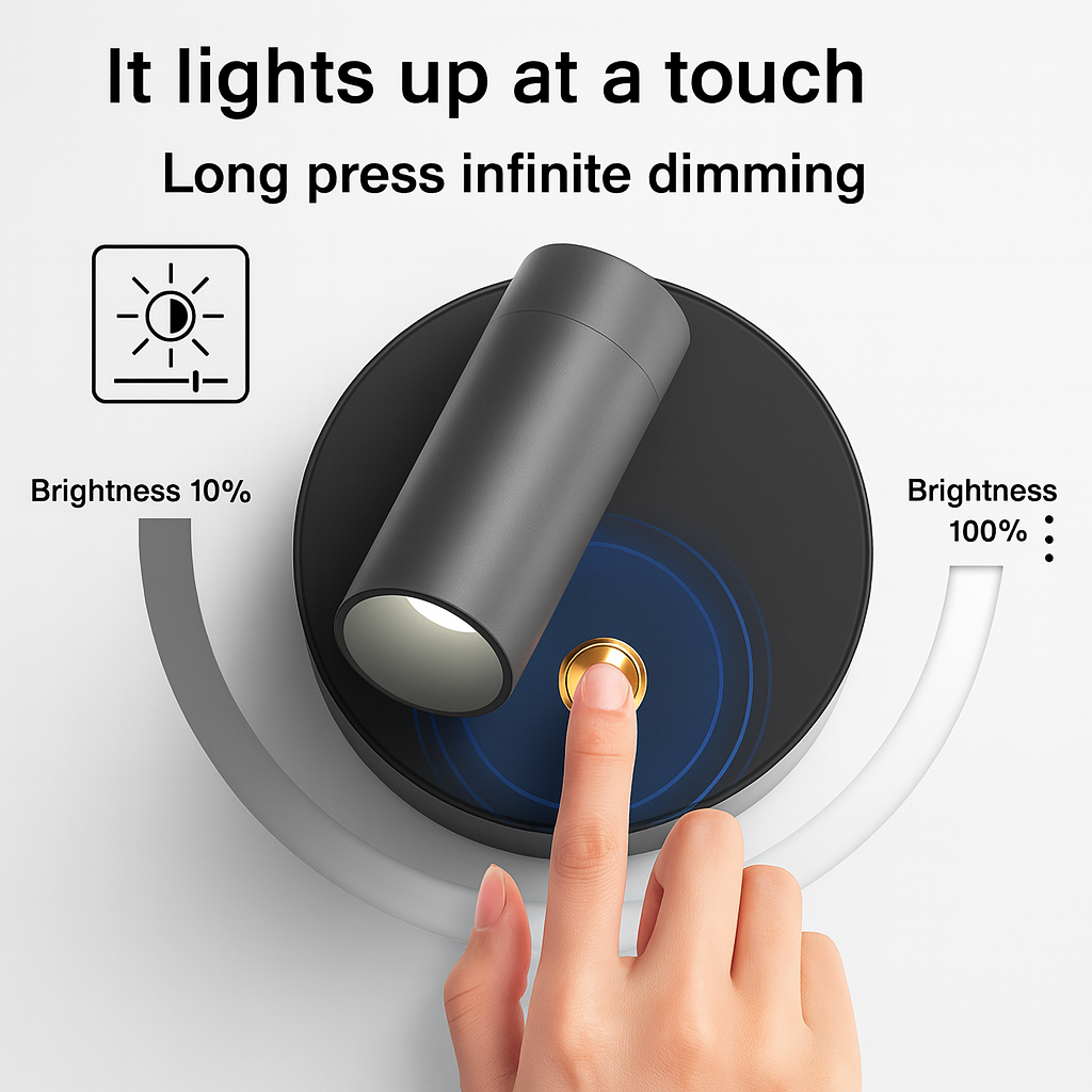 Transform the way you light your home with Our sleek, rechargeable LED spotlight. Designed with modern living in mind, it delivers focused illumination wherever you need it from the bedside to the kitchen, study, or hallway. Its touch-sensitive dimming allows you to create the perfect atmosphere, whether you want bright task lighting or a gentle evening glow.
