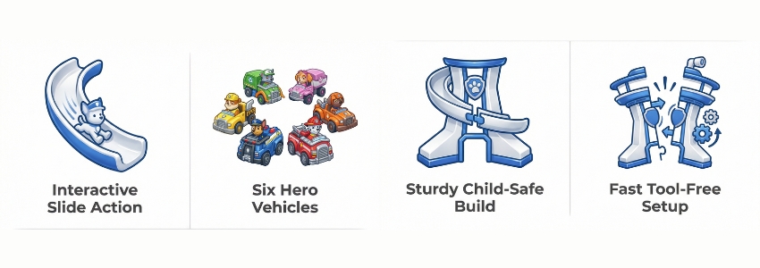 - Spiral Slide Action: Watch vehicles zoom down the track at high speed.