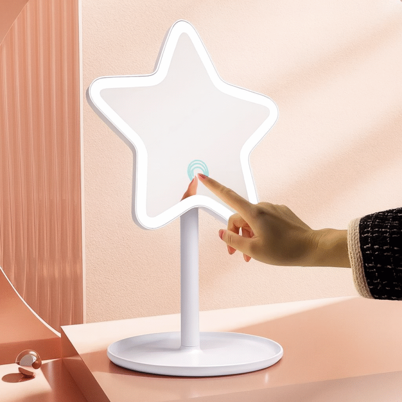 Compact yet eye-catching, this portable vanity mirror fits perfectly on your dressing table, desk, or bedside, adding a charming decorative touch to any room. The smart touch screen control lets you adjust the light with ease, so you can create the perfect lighting for any occasion. Get ready to shine – order your star mirror today and see your beauty in the best light.