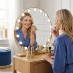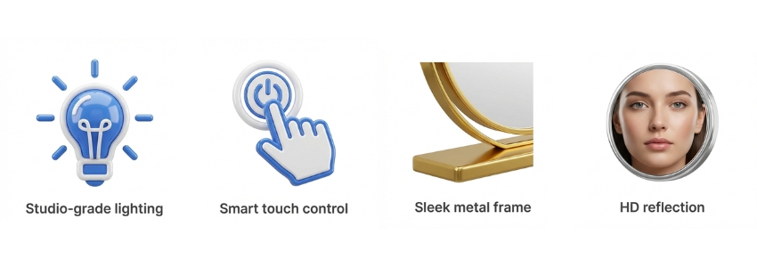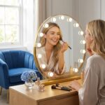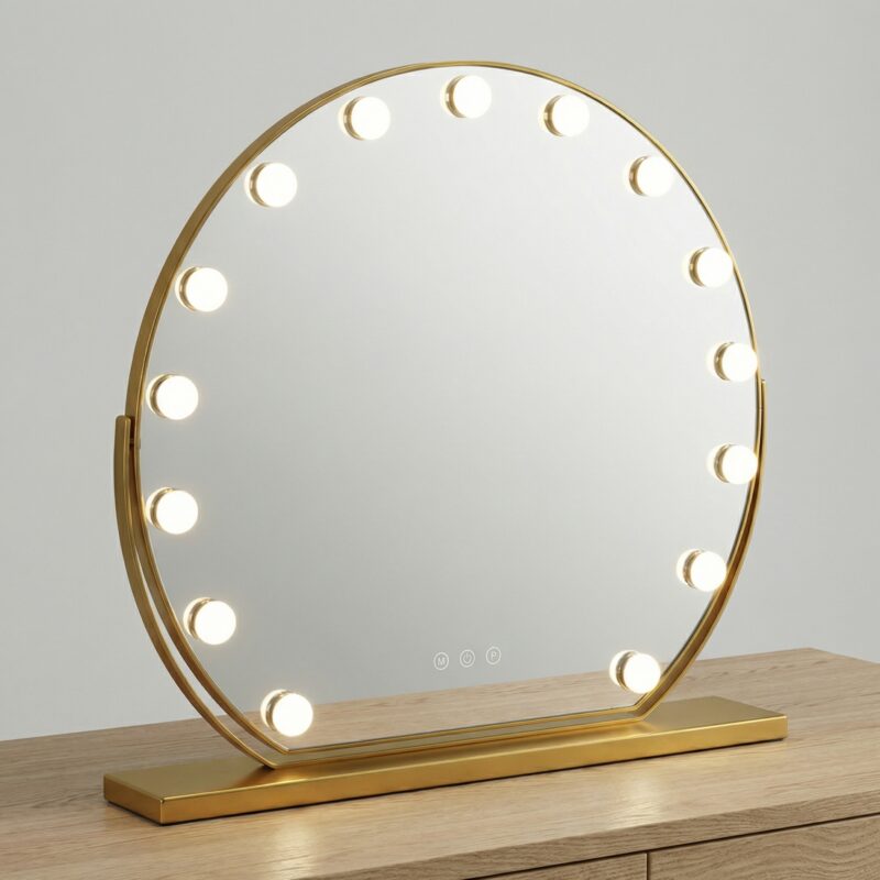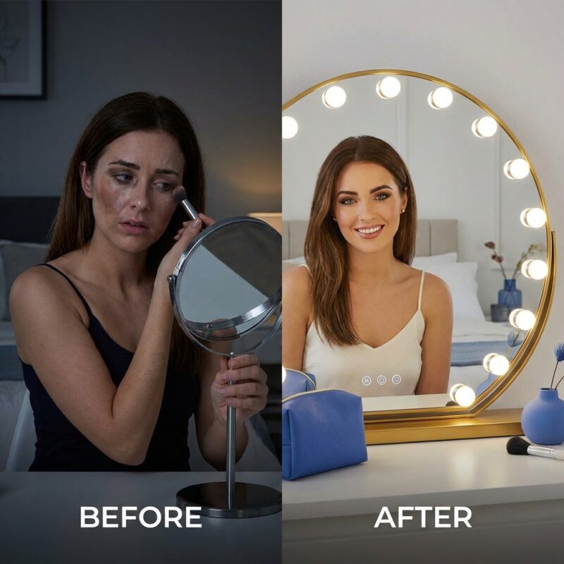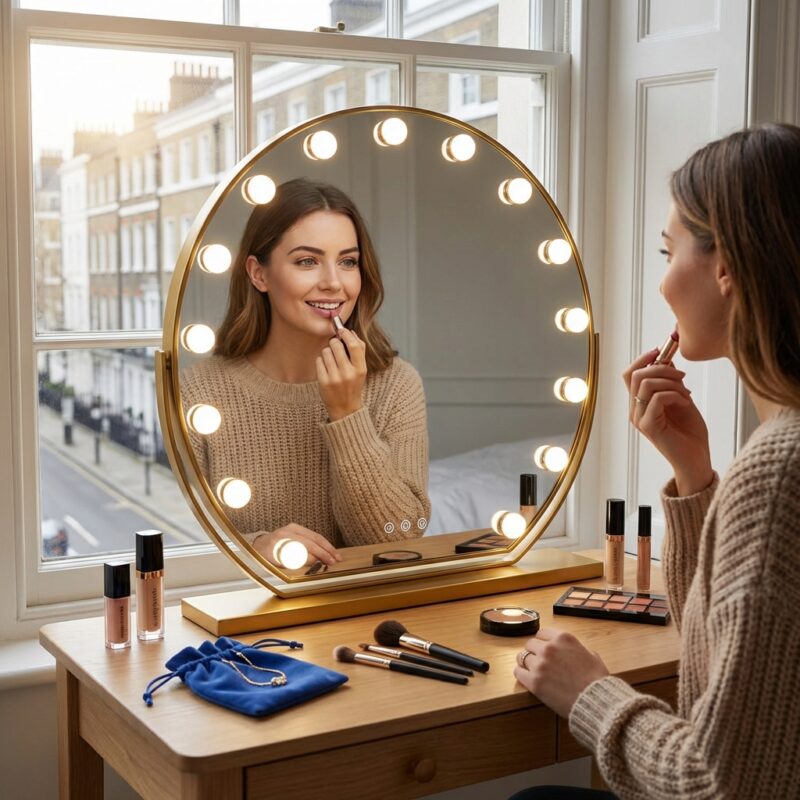 Elevate your daily ritual with the Stellure LED makeup mirror, featuring 11 professional-grade bulbs for uniform, shadow-free illumination. The sleek metal frame and HD glass offer a crystal-clear reflection, making it the ultimate illuminated dressing table mirror. Designed for modern British interiors, it ensures flawless cosmetic application and a luxury studio-quality glow.