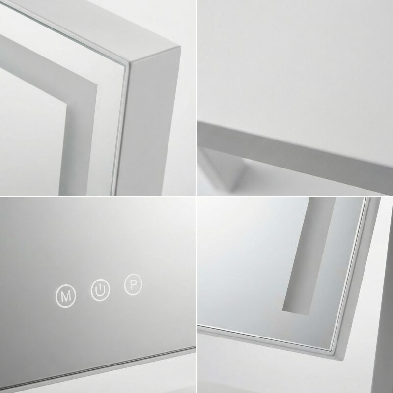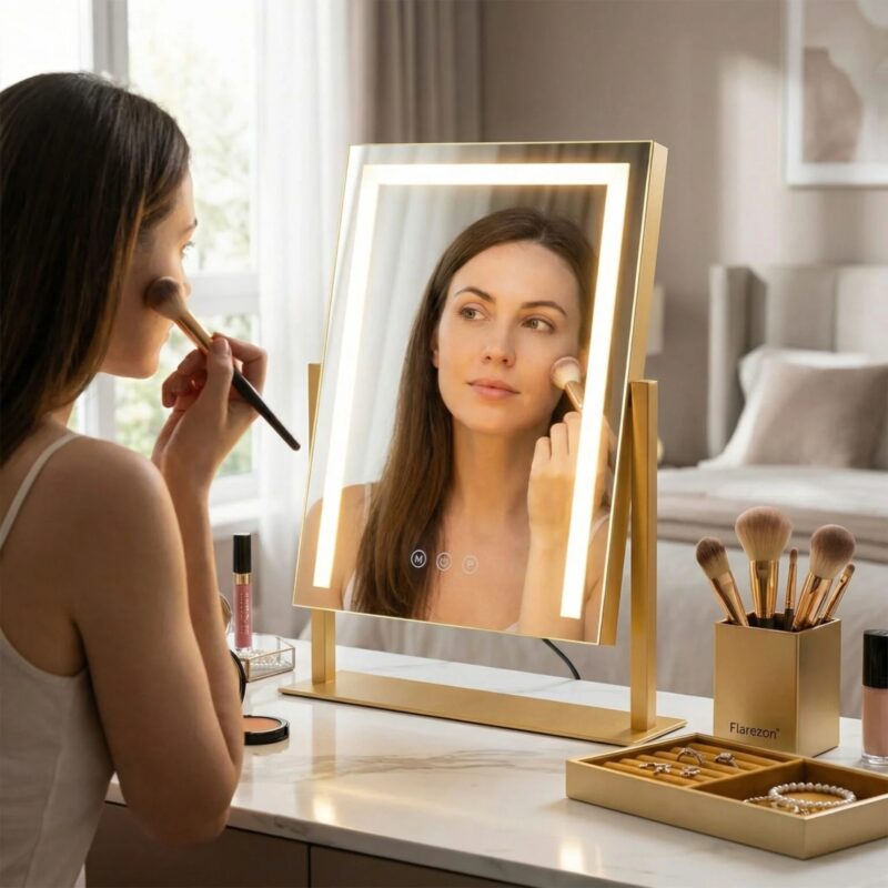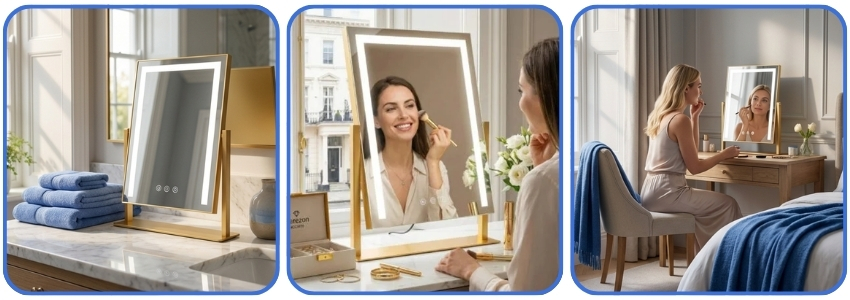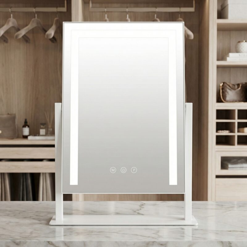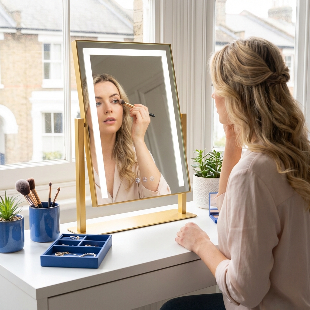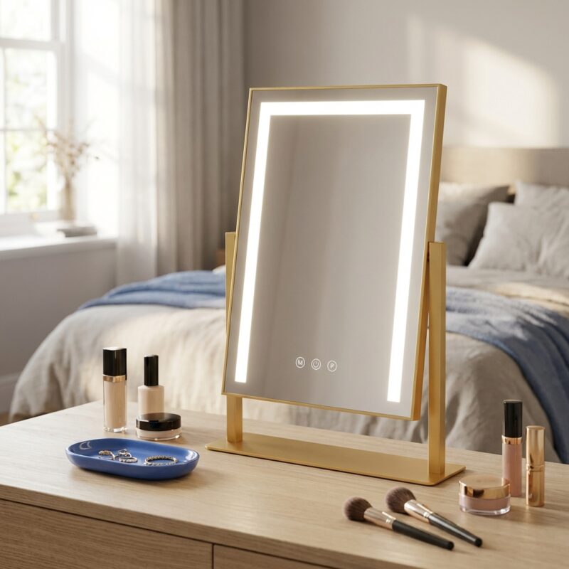 Designed for the modern bedroom, this vanity mirror with lights offers stepless dimming via responsive smart touch control. The 360-degree rotation allows you to find your best angle effortlessly. Available in premium Gold, White, or Black finishes, it meets strict UK safety standards, making it the ultimate luxury upgrade for your vanity.