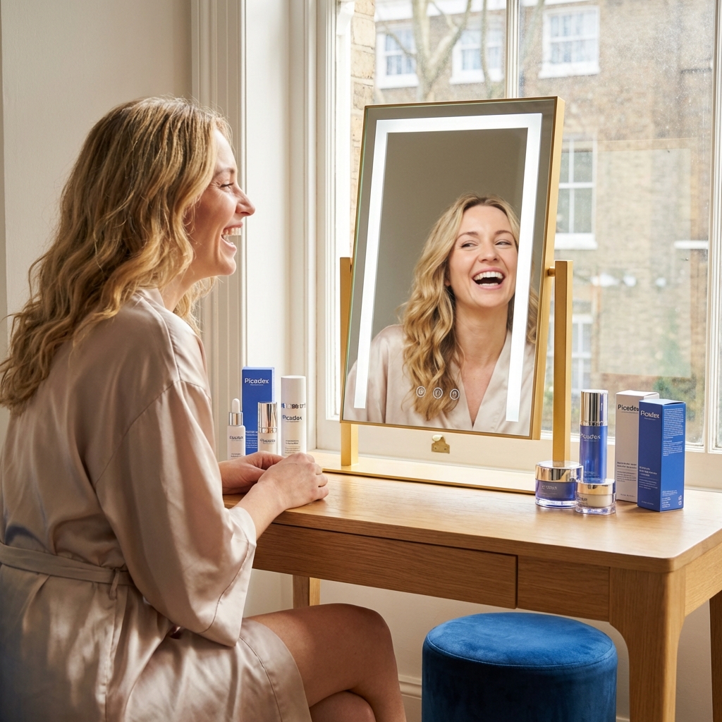 Elevate your beauty ritual with the VisiCore professional makeup mirror with lights. Featuring HD silver glass for crystal-clear reflection, this illuminated dressing table mirror ensures every detail is perfect. Experience tri-tone LED lighting that mimics natural daylight, providing the ideal environment for applying flawless makeup and professional-grade skincare in any room.