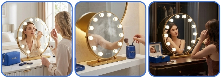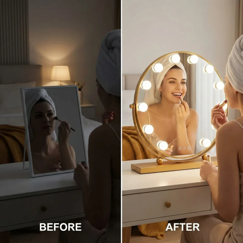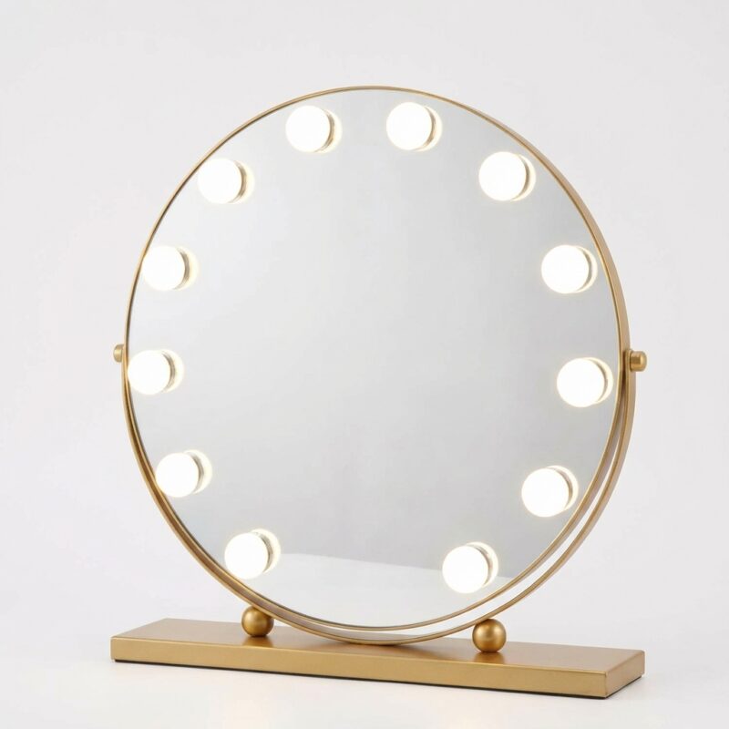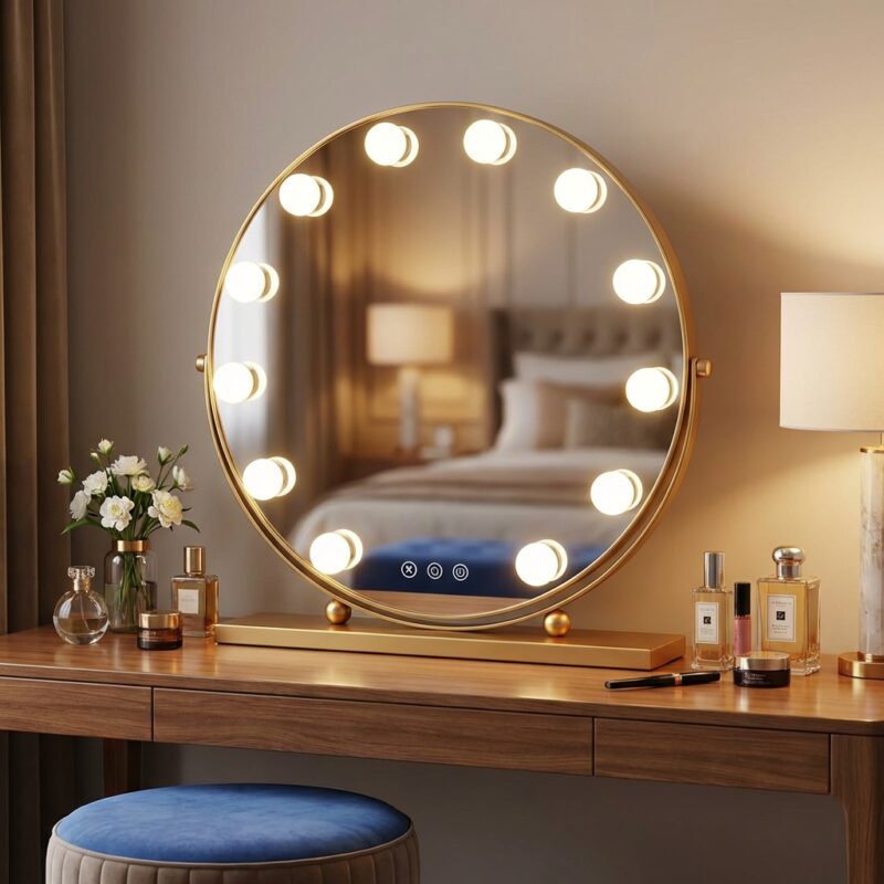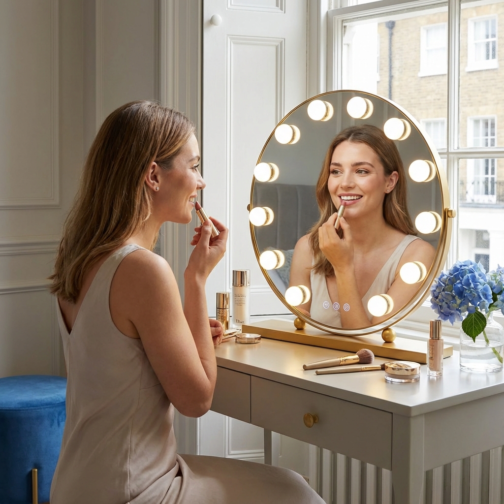 Designed for the modern UK home, this gold dressing table mirror combines an Art Deco aesthetic with high-tech functionality. The 360-degree rotation ensures you never miss an angle, while the copper-free HD glass provides crystal-clear reflection. Available in multiple sizes and power options, it is the ultimate illuminated dressing table mirror for your bedroom.