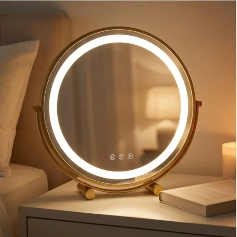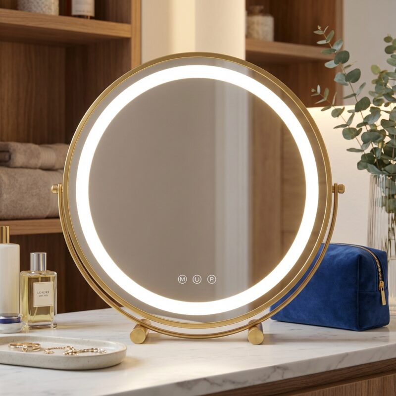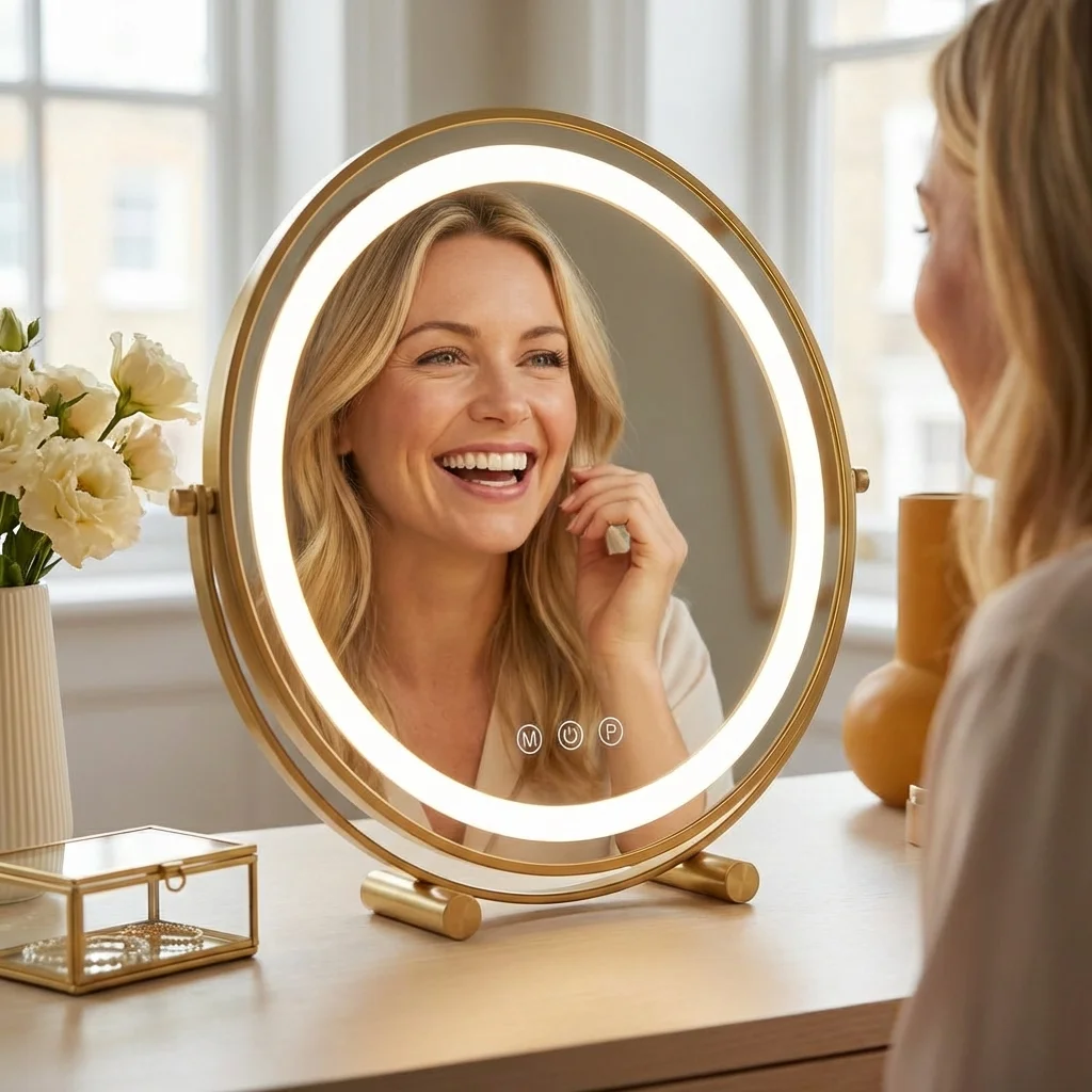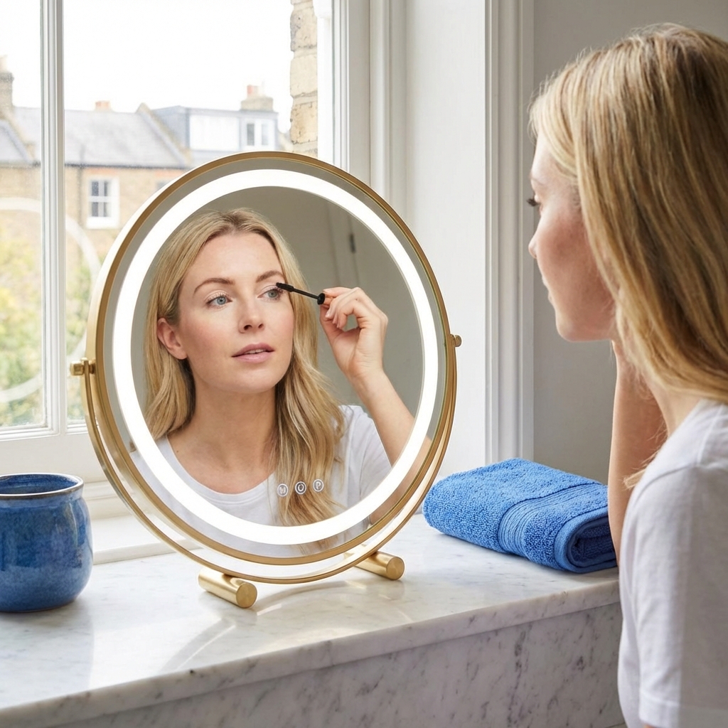 Crafted with a durable metal frame and available in 30cm to 50cm sizes, this mirror fits any interior style. Featuring 360-degree rotation and smart touch control dimming, it provides the ultimate flexibility for detailed grooming. Rest assured with UK safety standards and a sturdy anti-slip base that protects your furniture while you achieve that flawless glow.