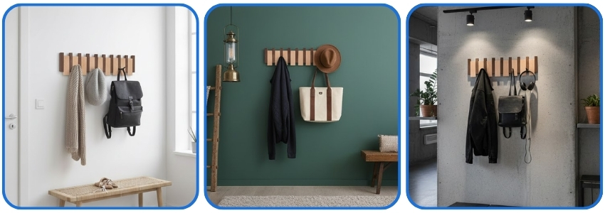 - tility & mudrooms – durable solid wood hooks for outdoor clothing, leads, and bags.
