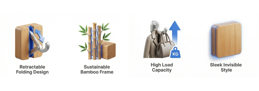 The Zentrix Retractable Bamboo Hook transforms cluttered entryways into minimalist havens. Crafted from sustainable bamboo and aviation-grade aluminum, this wall-mounted solution offers a sleek “invisible” design. The hooks fold away when not in use, maintaining a seamless aesthetic in your hallway, bathroom, or bedroom. It is the perfect blend of durability and modern style.
